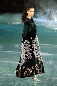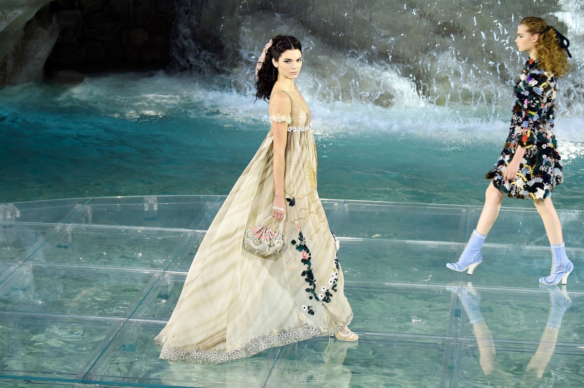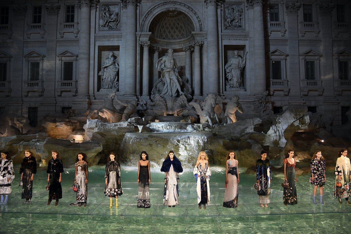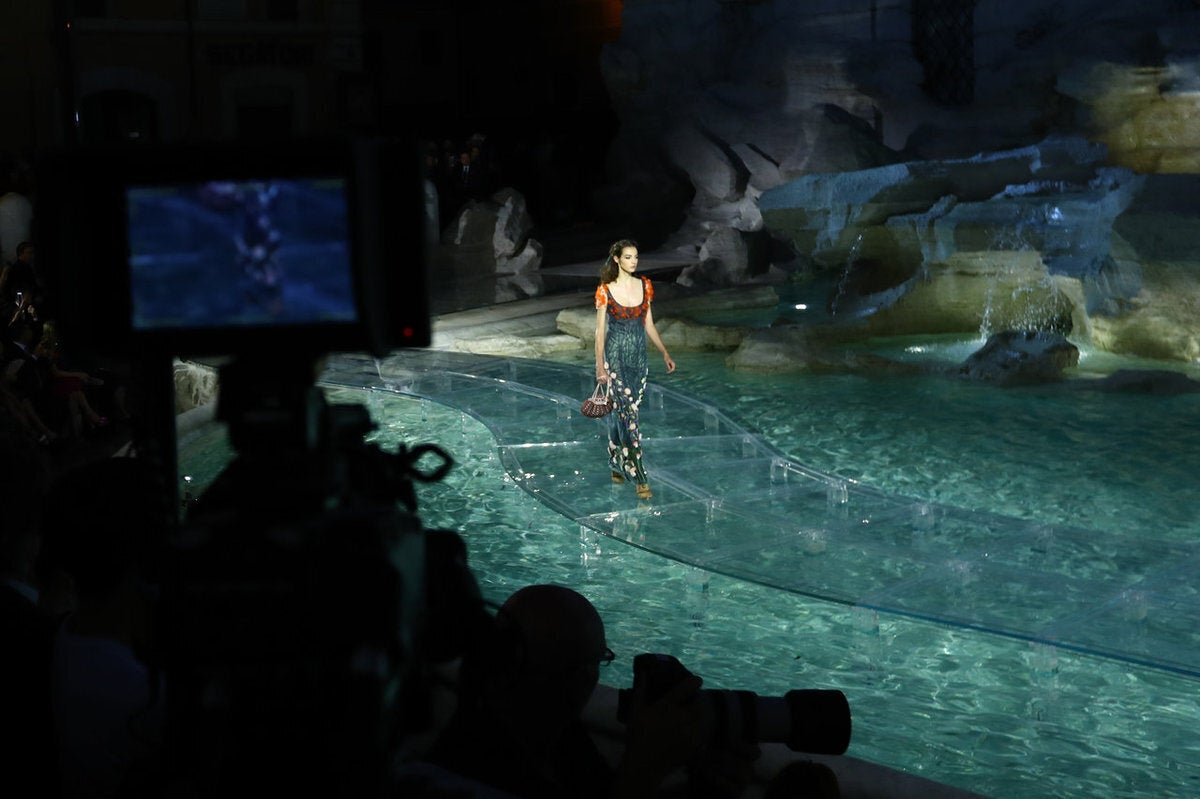 Η πασαρέλα στήθηκε ακριβώς πάνω από το ιστορικό συντριβάνι και τα μοντέλα, μεταξύ των οποίων ήταν η Bella Hadid και Kendal Jenner, έμοιαζαν να περπατούν πάνω στο νερό.