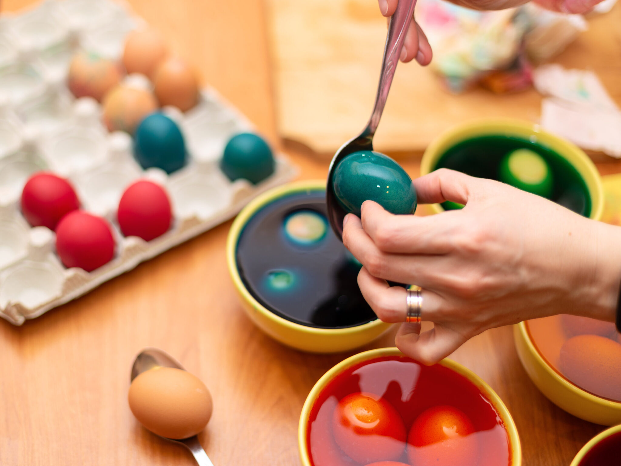 Στο ίδιο άρθρο σημειώνεται πώς για να περιορίσουμε τη δημιουργία λεκέδων, καλό είναι να χρησιμοποιούμε κουτάλι για να βγάζουμε τα αυγά από τη βαφή αντί να τα πιάνουμε με τα χέρια. Μια έξυπνη λύση είναι και η χρήση σύρματος (αυγοδάρτη), ώστε να βυθίζουμε και να βγάζουμε τα αυγά χωρίς επαφή. Εναλλακτικά, μπορούμε να επιλέξουμε τρόπους διακόσμησης χωρίς βαφή, όπως αυτοκόλλητα και άλλα υλικά, για ένα πιο καθαρό αποτέλεσμα.