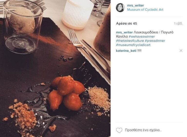 Αρχίσαμε με veloute πράσο και μπρουσκέτα με λούτζα Μυκόνου, πιάτο που κατά γενική ομολογία προκάλεσε ενθουσιασμό. Ακολούθησαν ντολμαδάκια κασιώτικα με ρύζι, μυρωδικά και σως γιαουρτιού με άρωμα δυόσμου και ρεβυθάδα σιφνέϊκη σιγομαγειρεμένη στο φούρνο με λεμόνι και δεντρολίβανο. Εάν έχετε αυτές τις γεύσεις στο μυαλό σας ως «ταπεινές», τότε σας προκαλούμε να δοκιμάσετε αυτές τις δύο εκδοχές, τόσο γεμάτες με γεύση και αρώματα, που θα σας αλλάξουν άποψη. Σειρά είχε το mille feuille μελιτζάνας με ratatouille λαχανικών και κρέμα από Καλαθάκι Λήμνου με δυόσμο, τομ οποίο και μας οδήγησε γευστικά στο τελευταίο πιάτο, φιλέτο κοτόπουλο ελευθέρας βοσκής μαριναρισμένο με ξύσμα λεμονιού, θυμάρι και φρέσκια ρίγανη σε φαγόπυρο με μυρωδικά. Ωστόσο, όσο υπέροχα και εάν ήταν όλα τα προηγούμενα πιάτα, ο νικητής ήταν αδιαμφισβήτητα ένας: τα λουκουμαδάκια με μέλι, καρύδια και το – συγκλονιστικό – παγωτό κανέλα. Είναι άλλωστε και εκείνο το πιάτο που ανακηρύχθηκε και νικητής του Instagram!