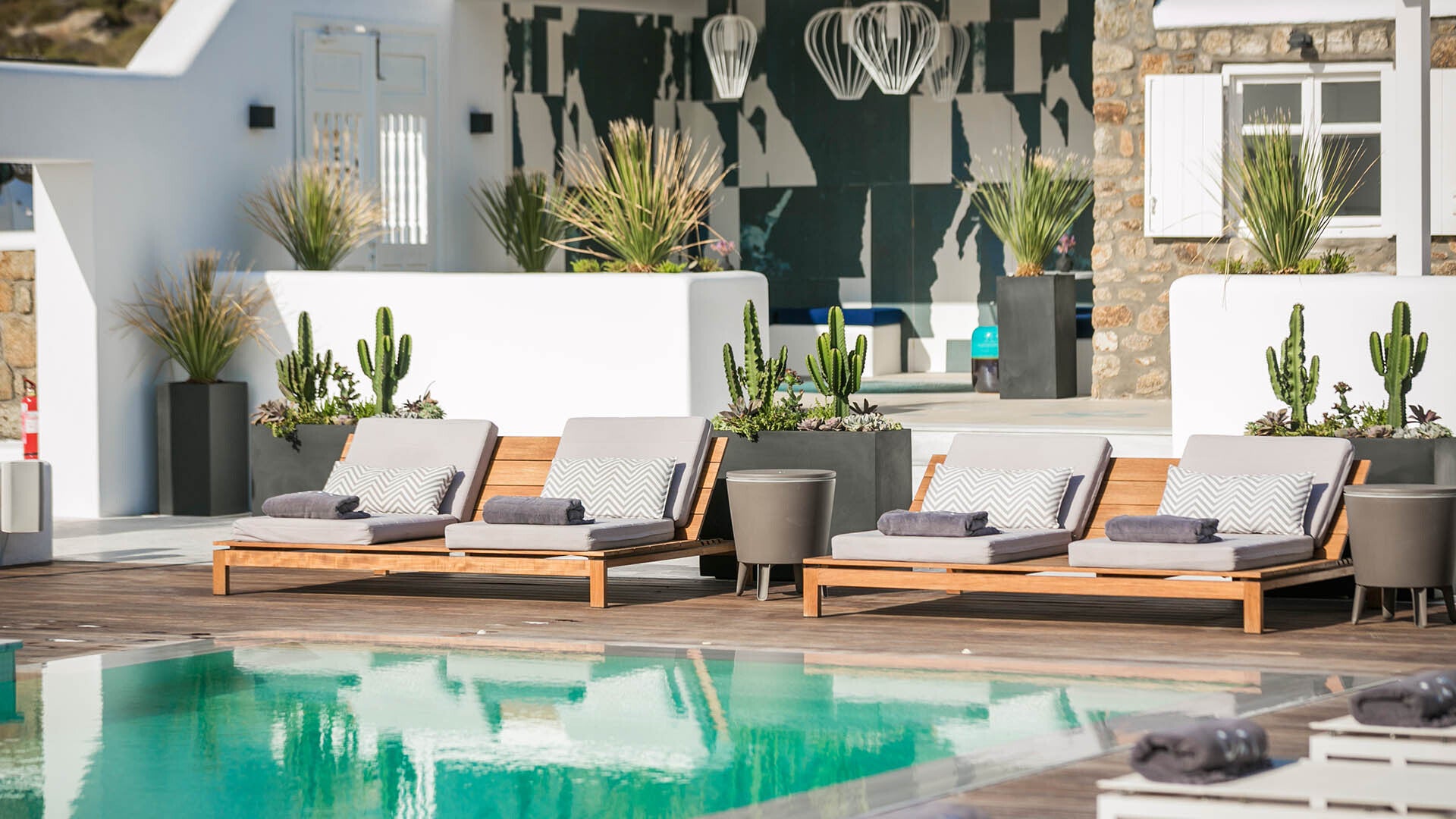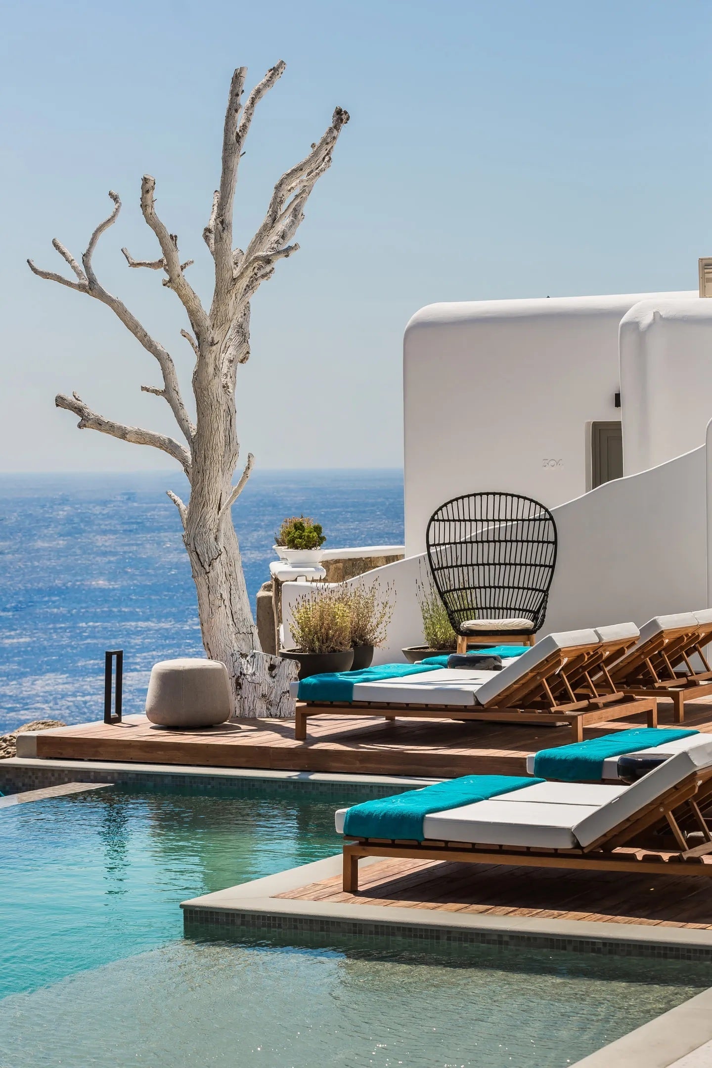 Στην κυκλαδίτικη αρχιτεκτονική του συγκροτήματος δεσπόζουν οι λιτές γραμμές που συνδυάζονται με τα φυσικά υλικά και τους γήινους τόνους στους εσωτερικούς χώρους και συνδυαστικά με το γαλάζιο της θάλασσας εξασφαλίζουν μια αναζωογονητική εμπειρία.