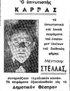 AdvertisementΥποβολή, υπνωτισμός, διόραση, νοομαντεία, μεταβίβαση σκέψης και καταληψία! Σε αυτά τα υπερφυσικά «πειράματα» ειδικευόταν το ζευγάρι Καρρά που γυρνούσαν όλη την Ελλάδα, η Στέλλα και ο υπνωτιστής σύζυγος της έδιναν παραστάσεις για να κερδίσουν δόξα και πάλευαν για το μεροκάματο και την επιβίωση.