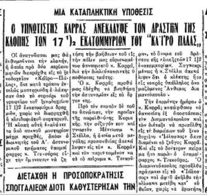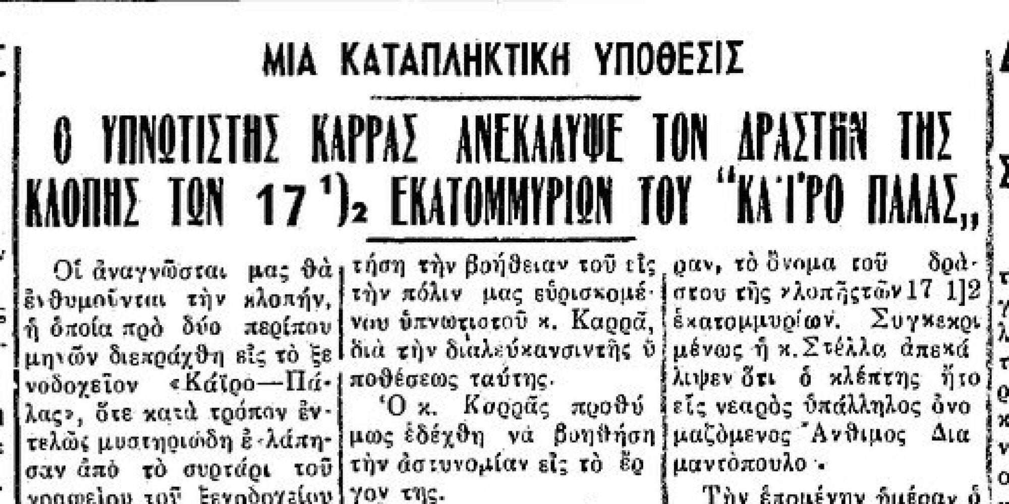 AdvertisementΗ μαγεία δεν σταμάτησε εκεί! Την επόμενη μέρα ο υπνωτιστής Καρράς υπνώτισε από απόσταση και τον κλέφτη του Κάιρο Παλλάς! Και τον ανάγκασε να πάει γραμμή στην αστυνομία για να καταθέσει όλη την αλήθεια και να επιστρέψει όσα χρήματα του είχαν απομείνει! Έτσι ακριβώς έγινε και σχεδόν όλο το ποσό, εκτός από 3,5 εκατομμύρια δραχμές που ο δράστης πρόλαβε να σκορπίσει σε ψώνια και διασκεδάσεις, γύρισαν στους ξενοδόχους.