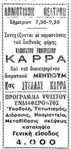 Το μέντιουμ Στέλλα Καρρά με τον διάσημο υπνωτιστή σύζυγο της έδιναν τις πειραματικές τους παραστάσεις στο δημοτικό θέατρο της Ρόδου και έμεναν στο ξενοδοχείο «Ιαλυσσός». Κάθε μέρα έβγαιναν τρεις φορές στις σκηνή, στις 16:00, στις 19:00 και στις 21:30 και έκαναν τα μοναδικά νούμερα τους.
