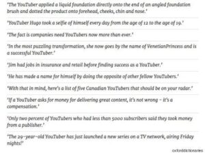 Το καλύτερο κομμάτι της νέας αυτής καταχώρησης, βέβαια, είναι τα παραδείγματα που δίνει το λεξικό κάτω από το λήμμα για να περιγράψει καλύτερα τους τρόπους χρήσης του. Για παράδειγμα «Ο YouTuber Hugo έβγαζε από μια selfie του εαυτού του κάθε μέρα, από όταν ήταν 13 χρονών μέχρι τα 19 του» ή «Ο Jim εργαζόταν στον τομέα των ασφαλίσεων και της λιανικής πριν βρει την επιτυχία ως YouTuber» ή «Αν ένας YouTuber ζητήσει χρήματα για να παρουσιάσει ωραίο περιεχόμενο, δεν είναι λάθος, είναι αποζημίωση».