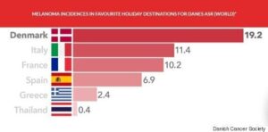 Σύμφωνα με τo ερευνητικό κέντρο, Danish Cancer Society κάθε μέρα ένας Δανός πεθαίνει από καρκίνο του δέρματος. Αιτία είναι η χωρίς προφυλάξεις έκθεση τους στον ήλιο κυρίως σε χώρες όπως η Ελλάδα, η Ιταλία, η Γαλλία, η Ισπανία και η Ταϊλάνδη τις οποίες επιλέγουν για να περάσουν τις διακοπές τους, να απολαύσουν το ήλιο και τη θάλασσα.