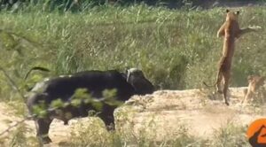 Σύμφωνα με τη Times, όλα ξεκίνησαν όταν μια σαύρα έγινε εύκολη λεία για μια αγέλη λιονταριών. Αυτό που ακολούθησε όμως δεν ήταν τόσο ευχάριστο για τα λιοντάρια. Καθώς δυο από αυτά απομονώθηκαν για να απολαύσουν το θήραμά τους, το ένα δέχτηκε αιφνιδιαστική επίθεση από ένα βουβάλι. Tόσο η επίθεση του βουβαλιού όσο και η εναέρια πτώση του λιονταριού είναι πραγματικά θεαματικές. Αν και δεν έχει εξακριβωθεί αν η σαύρα έζησε,σίγουρα άξιζε το συγκεκριμένο στιγμιότυπο, κυρίως για τη δικά μας θέαση.