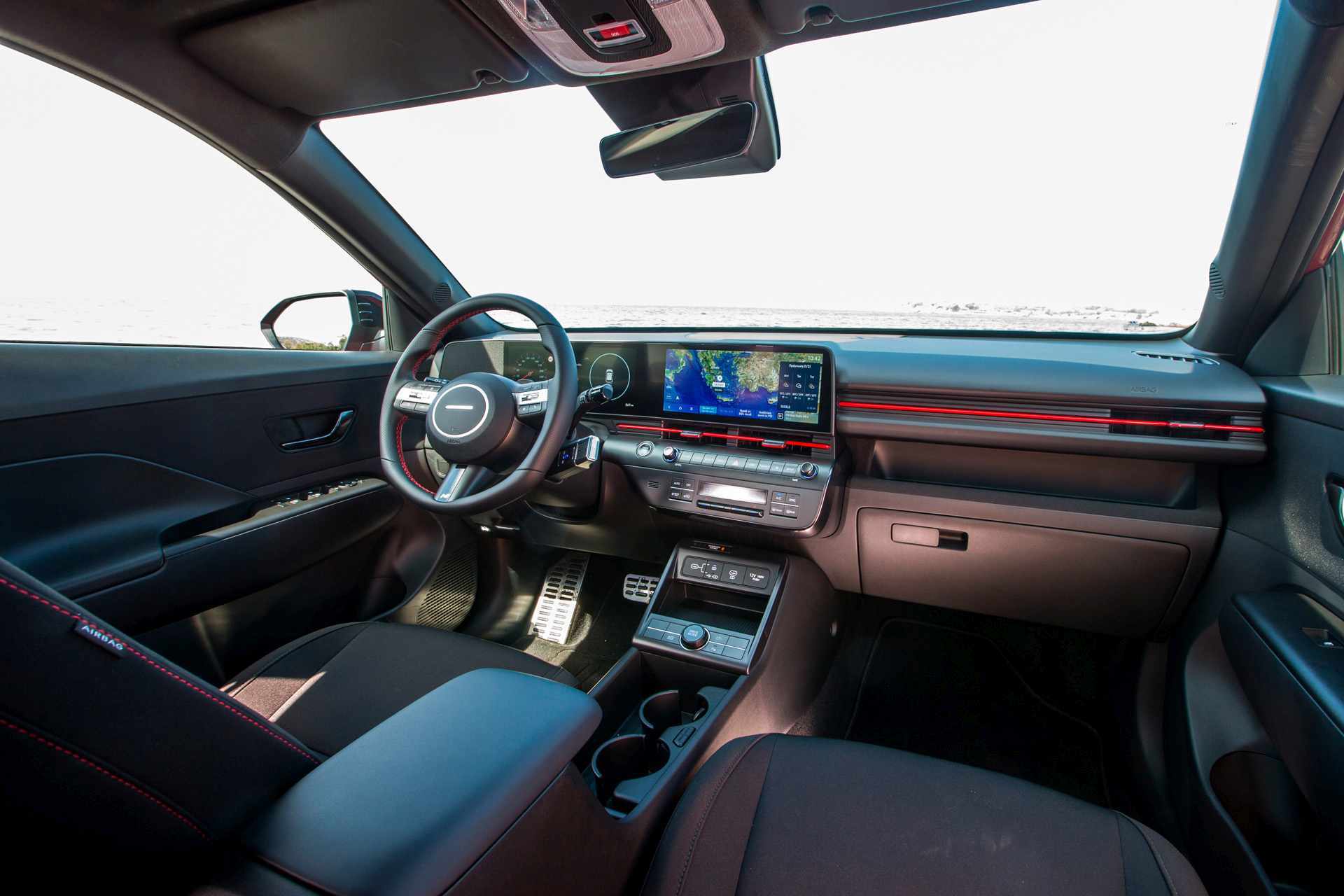 Χάρη στις αναβαθμισμένες διαστάσεις του μοντέλου και την καινοτόμο αρχιτεκτονική που προέρχεται από το ΚΟΝΑ EV, η Hyundai Motor κατάφερε να σχεδιάσει έναν μεγαλύτερο «χώρο διαβίωσης». Το οδηγοκεντρικό ταμπλό τονίζεται από ένα αιωρούμενο οριζόντιο C-Pad με ενσωματωμένες τις διπλές οθόνες 12,3 ιντσών που τονίζουν τον high-tech χαρακτήρα του νέου KONA. Ως μέρος της νέας διάταξης του νέου ηλεκτροκίνητου KONA, ο επιλογέας ταχυτήτων shift-by-wire έχει μεταφερθεί από την κεντρική κονσόλα στην κολόνα του τιμονιού, γεγονός που επιτρέπει περισσότερο χώρο αποθήκευσης στην κονσόλα. Ο φωτισμός καμπίνας υποστηρίζεται επίσης από πλήρεις ενημερώσεις Over-the-Air (OTA) για συντήρηση και νέες δυνατότητες. Τα μπροστινά καθίσματα παρέχουν βελτιωμένη άνεση στην κατανομή της πίεσης του σώματος βοηθώντας στην ανακούφιση της κόπωσης μετά την οδήγηση. Το Curveless Bench Seat στη πίσω σειρά καθισμάτων μεγιστοποιεί την πρακτικότητα και διαθέτει μοχλό δύο σταδίων για εύκολη ανάκληση.