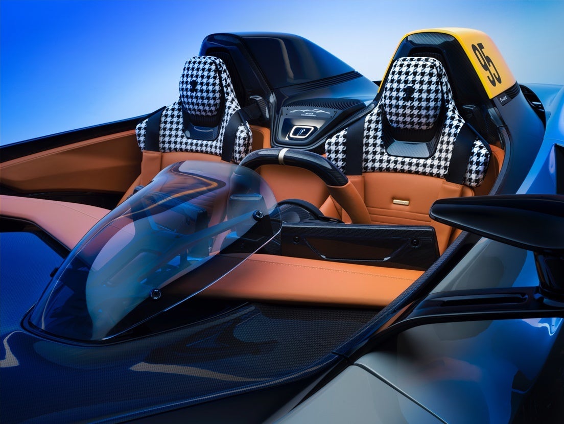 Το εσωτερικό είναι η επιτομή ενός κλασικού αγωνιστικού αυτοκινήτου που συναντά τη φουτουριστική σχεδίαση.Μαζί με το γλυπτό ταμπλό από ανθρακονήματα, δημιουργείται ένα εφέ αιωρούμενου φτερού. Το ταμπλό είναι επενδεδυμένο με Tan Sustainable Luxury Leather με ανάγλυφο, κατά παραγγελία, το οποίο έρχεται σε αντίθεση με το βουρτσισμένο μαύρο φινίρισμα ανοδιωμένου αλουμινίου που εμφανίζεται σε άλλα σημεία.