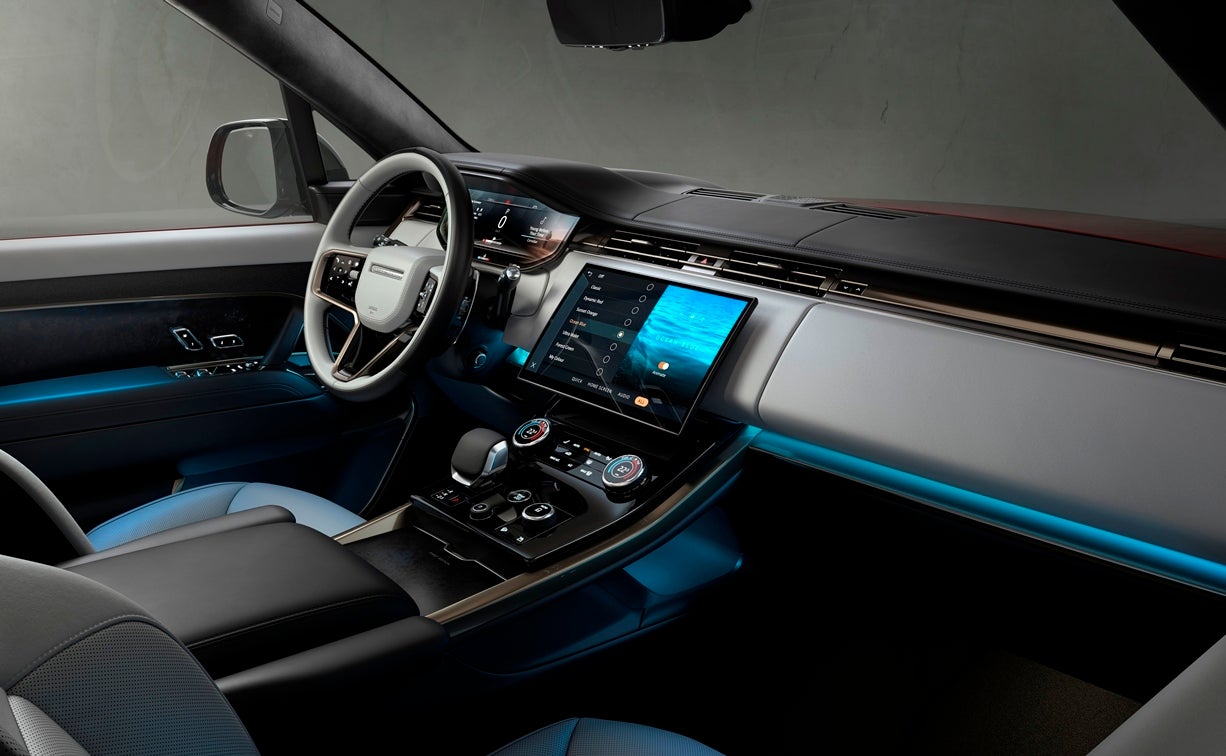 Η μινιμαλιστική σχεδίαση του νέου Range Rover Sport επεκτείνεται στο εντελώς νέο εσωτερικό, όπου κυριαρχούν η ηγετική θέση οδήγησης Command Driving Position – σήμα κατατεθέν του Range Rover – οι πιο πρόσφατες τεχνολογίες και τα καλύτερα. Η γκάμα καινοτόμων και βιώσιμων υλικών περιλαμβάνει απτικά και ελαφριά premium υφάσματα Ultrafabrics, ενώ διατίθεται και υφασμάτινη επένδυση που εκτείνεται μέχρι το ταμπλό και τις λεπτομέρειες θυρών.