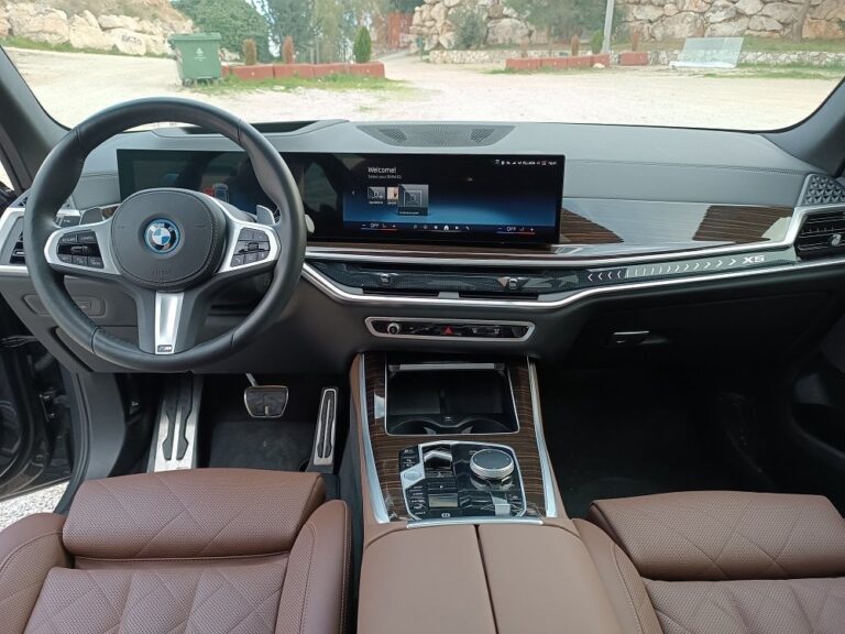 Μπαίνοντας στο εσωτερικό, δεν μπορείς παρά να μην διαπιστώσεις την ποιότητα, το φινίρισμα και την αισθητική της X5 xDrive50e. Η κυρτή οθόνη BMW Curved Display αποτελείται από τον πίνακα οργάνων των 12,3 ιντσών και την οθόνη αφής των 14,9 για τα πολυμέσα. Αυτά διαχειρίζονται μέσω και του περιστροφικού διακόπτη στη βάση της κεντρικής κονσόλας, εκεί όπου βρίσκονται, άλλωστε και τα προφίλ οδήγησης, όπως επίσης η ρύθμιση της αερανάρτησης. Χώροι και άνεση παραμένουν σε υψηλά… στάνταρ στην Χ5. Το σαλόνι διαθέτει αναπαυτικά καθίσματα, μεγάλους χώρους και χάρη στο μεταξόνιο των 2.975χλστ., κανείς δεν θα διαμαρτυρηθεί.