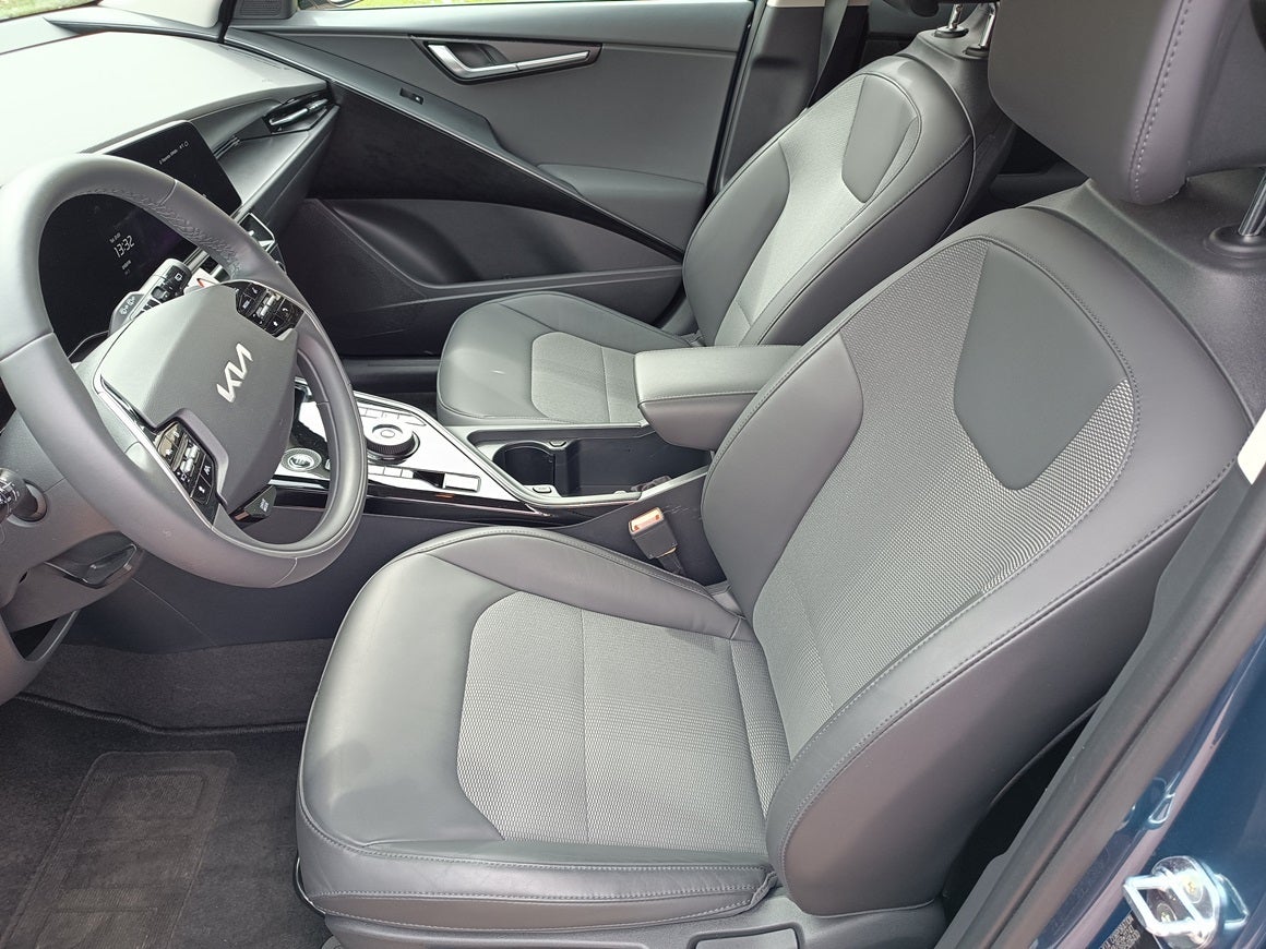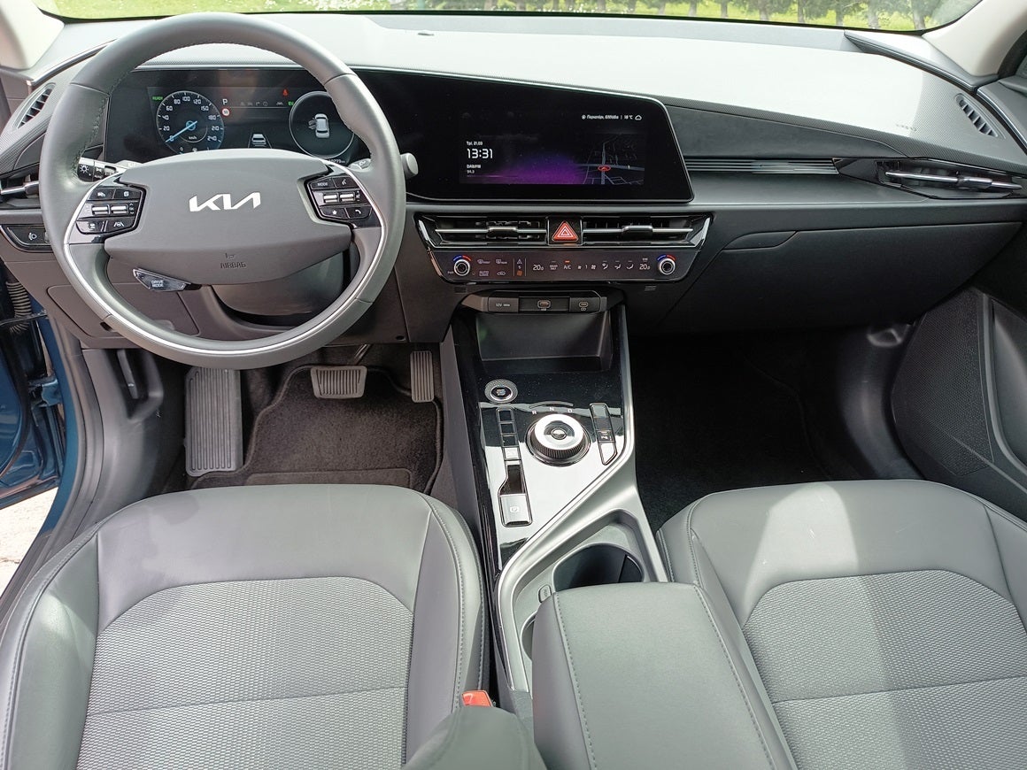 Όμορφο και καλοσχεδιασμένο χαρακτηρίζεται το εσωτερικό του αυτοκινήτου, έχοντας κι εκεί δανειστεί κάποια στοιχεία από τα Sportage και EV6. Δεσπόζουν οι δύο ψηφιακές οθόνες των 10,25 ιντσών η κάθε μια, με τη δεύτερη, των πολυμέσων δηλαδή, να ακολουθεί την καμπύλη του ταμπλό. Είναι ψηλά τοποθετημένη, από κάτω εντοπίζονται οι κομψοί αεραγωγοί και λίγο πιο κάτω, οι διακόπτες που ρυθμίζουν τον κλιματισμό ή το ηχοσύστημα. Η ποιότητα μπορεί να χαρακτηριστεί εφάμιλλη του Sportage σε μερικούς τομείς, η εργονομία βρίσκεται σε πάρα πολύ καλά επίπεδα και η πρακτικότητά του ενισχύεται από τον περιστροφικό διακόπτη του επιλογέα. Παράλληλα, «κερδίζεται» με αυτόν τον τρόπο χώρος για τους εμπρός επιβαίνοντες. Το μεταξόνιό του ανέρχεται στα 2,720μ., συνεισφέροντας στην άνεση των πίσω επιβατών, με τη χωρητικότητα να μπορεί να αυξηθεί στα 1.445 λίτρα, εφόσον αναδιπλωθούν τα πίσω καθίσματα. Αν βρίσκονται κανονικά στη θέση τους, η χωρητικότητα του πορτ-μπαγκάζ ανέρχεται στα 451 λίτρα.