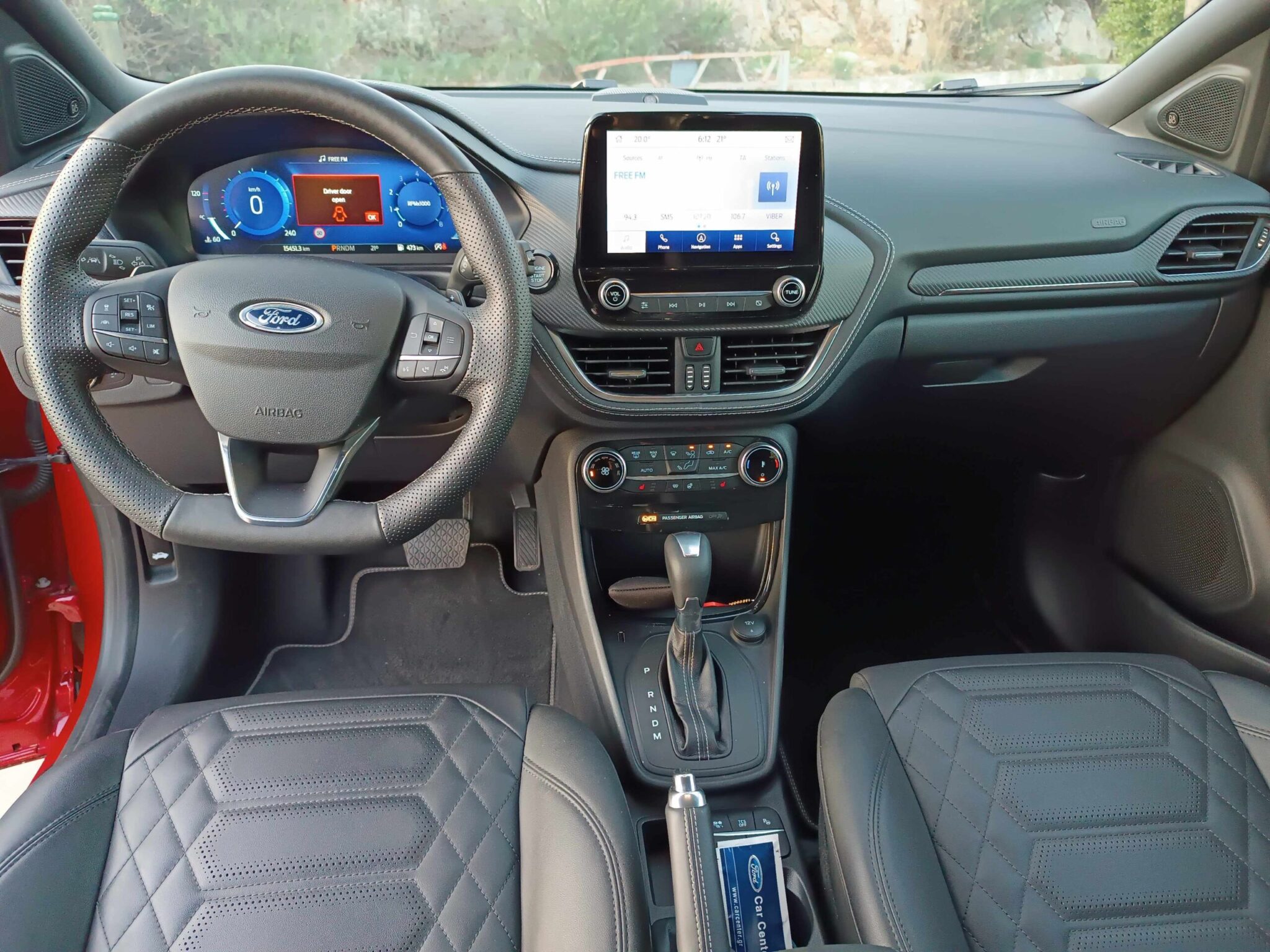 Το αυτοκίνητο της δοκιμής, που ήταν ένα Puma 1.0L mHEV 155hp ST Line, είχε κόκκινες ραφές σε επενδύσεις, τιμόνι και λεβιέ που το έκαναν ακόμα πιο όμορφο και τη διαμονή στην καμπίνα να εύχεσαι να μην τελειώσει ποτέ. Ο ψηφιακός πίνακας οργάνων είναι 12,3 ιντσών, οκτώ η οθόνη των πολυμέσων, συμπληρώνοντας πολύ ωραία το όλο σκηνικό.