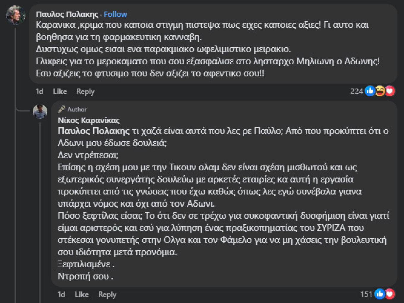 Στη συνέχεια, η αντιπαράθεση κλιμακώθηκε με προσωπικές αιχμές. Ο Καρανίκας επέκρινε τον Πολάκη για τη στάση του στο εσωτερικό του κόμματος, υποστηρίζοντας ότι επιδιώκει να διατηρήσει τη θέση του μέσω πολιτικών ισορροπιών. Η διαδικτυακή σύγκρουση ανέδειξε για ακόμη μία φορά τις εσωτερικές εντάσεις και τις δημόσιες διαφωνίες στον χώρο της αντιπολίτευσης.