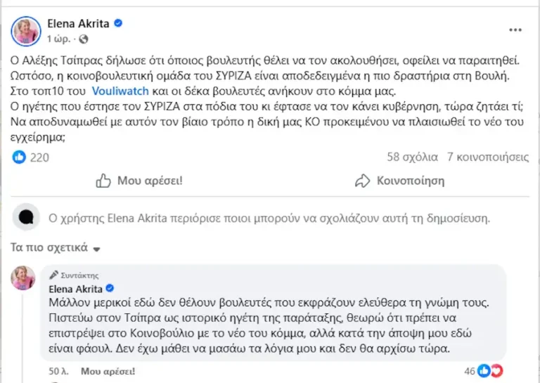 Η Έλενα Ακρίτα σε ανάρτησή της τόνισε ότι η βουλευτική ομάδα του ΣΥΡΙΖΑ είναι η πιο δραστήρια στη Βουλή, με τους δέκα πρώτους βουλευτές στο Vouliwatch να ανήκουν στο κόμμα της Κουμουνδούρου.