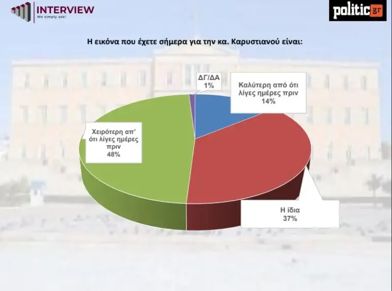 Όσον αφορά, δε, την εικόνα της Μαρίας Καρυστιανού μετά τη συνέντευξη όπου διατύπωσε τις θέσεις για τις αμβλώσεις, το 48% δηλώνει ότι η εικόνα της είναι χειρότερη σε σχέση με λίγες ημέρες πριν, το 37% ότι παραμένει η ίδια, ενώ το 14% ότι είναι καλύτερη.