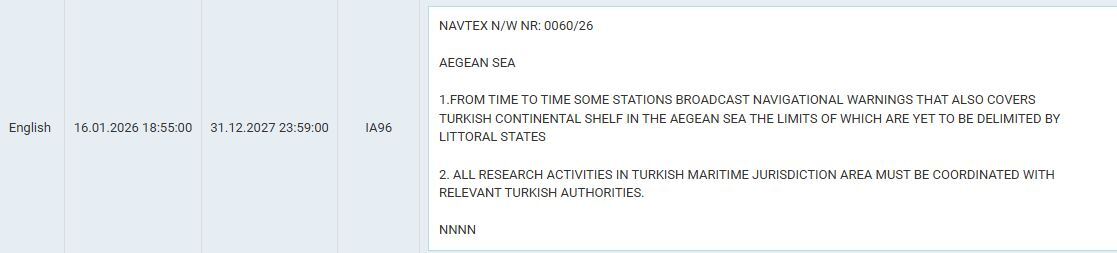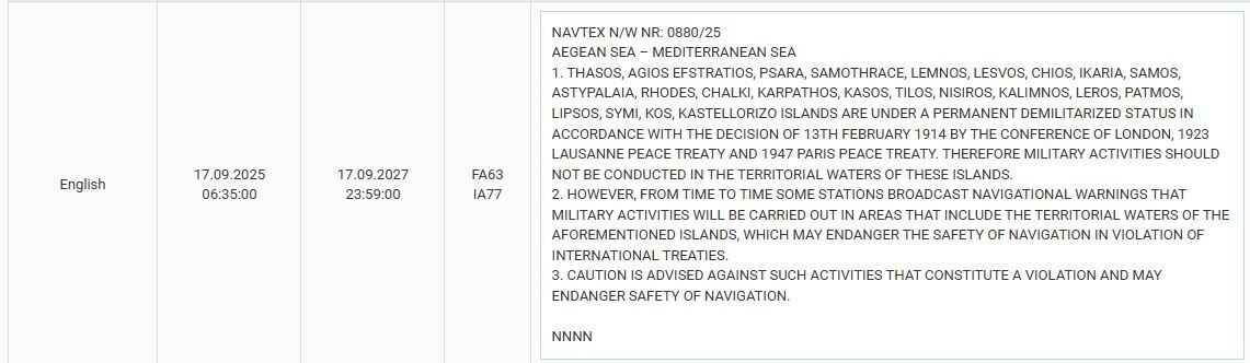 Σε πρόσφατη σύνοψη τουρκικών NAVTEX όπου περιλαμβάνονται οι NAVTEX που είναι σε ισχύ έχουν συμπεριληφθεί η 0060/26 και η 0880/25: Στη NAVTEX υπ’αριθμόν 0060/26 υποστηρίζεται πως «κατά καιρούς κάποιοι σταθμοί μεταδίδουν προειδοποιήσεις ναυσιπλοΐας που καλύπτουν επίσης τουρκική υφαλοκρηπίδα στο Αιγαίο τα όρια της οποίας δεν έχουμε ακόμα οριοθετηθεί από τα παράκτια κράτη. Όλες οι ερευνητικές δραστηριότητες σε τουρκική θαλάσσια δικαιοδοσία πρέπει να γίνονται σε συντονισμό με τις αρμόδιες τουρκικές αρχές».