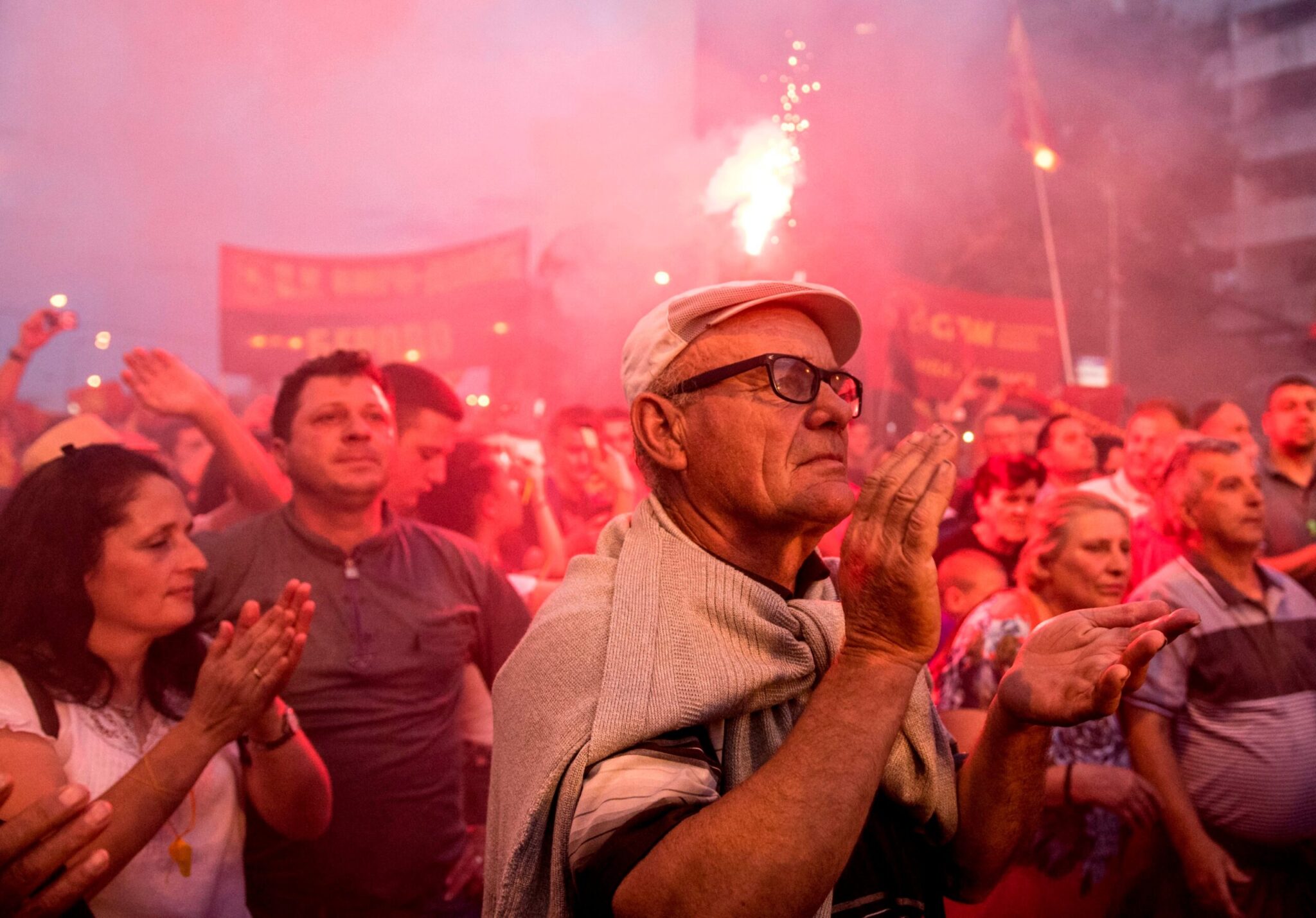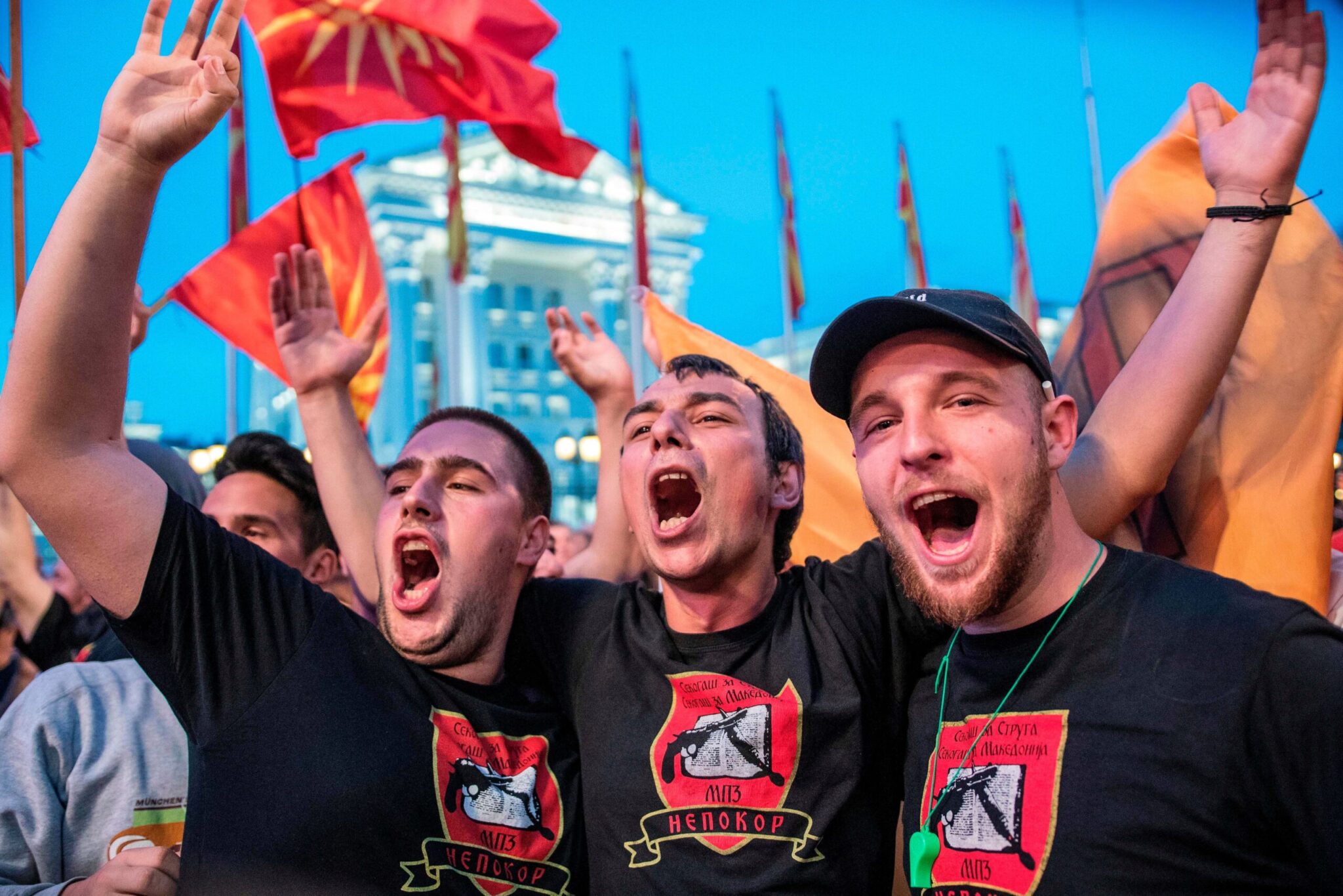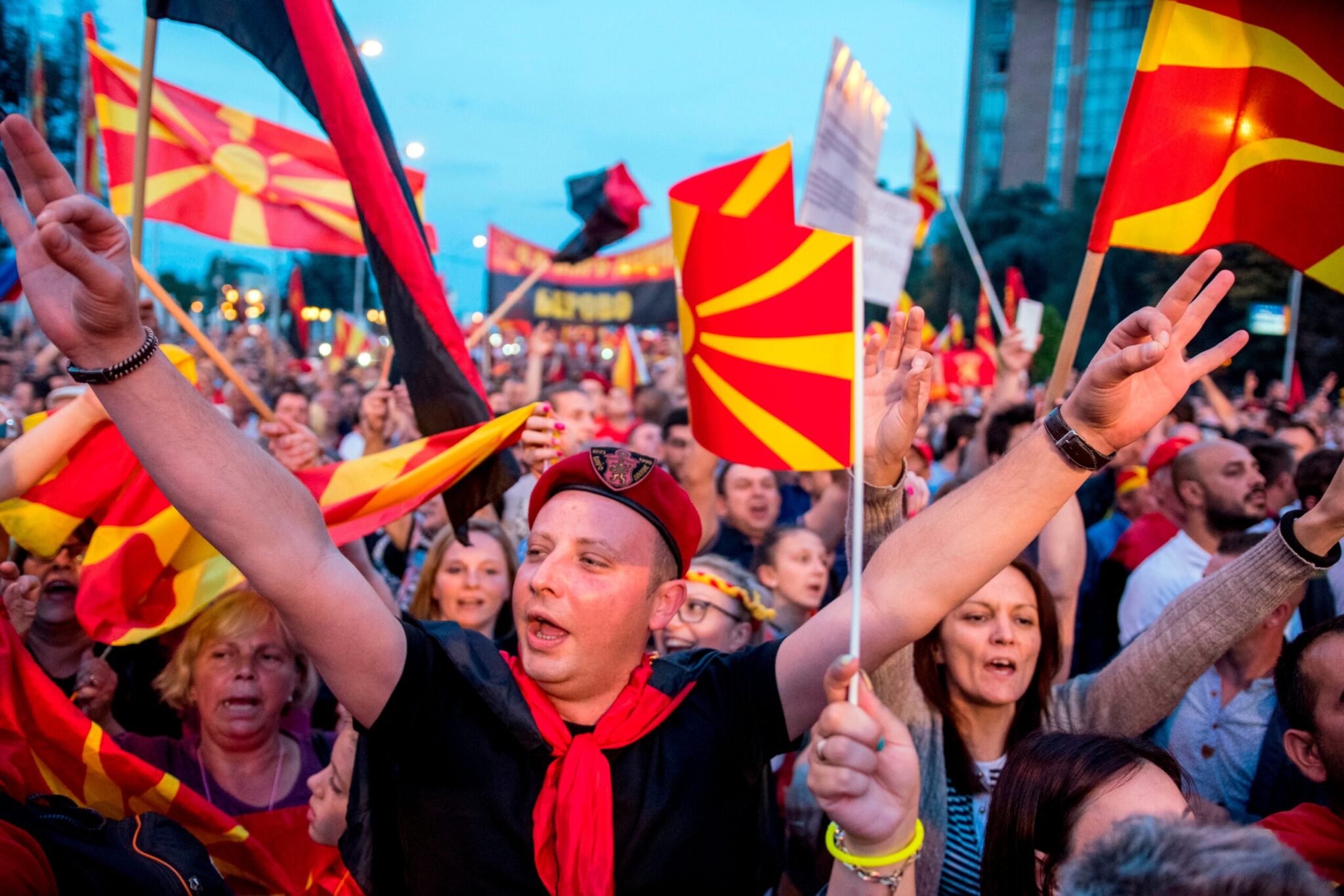 Οι διαδηλωτές είχαν συγκεντρωθεί έξω από το κτίριο της κυβέρνησης στα Σκόπια κρατώντας σημαίες της χώρας, ενώ κάποιοι είχαν πανό που έγραφαν: «Η Μακεδονία θα κερδίσει».