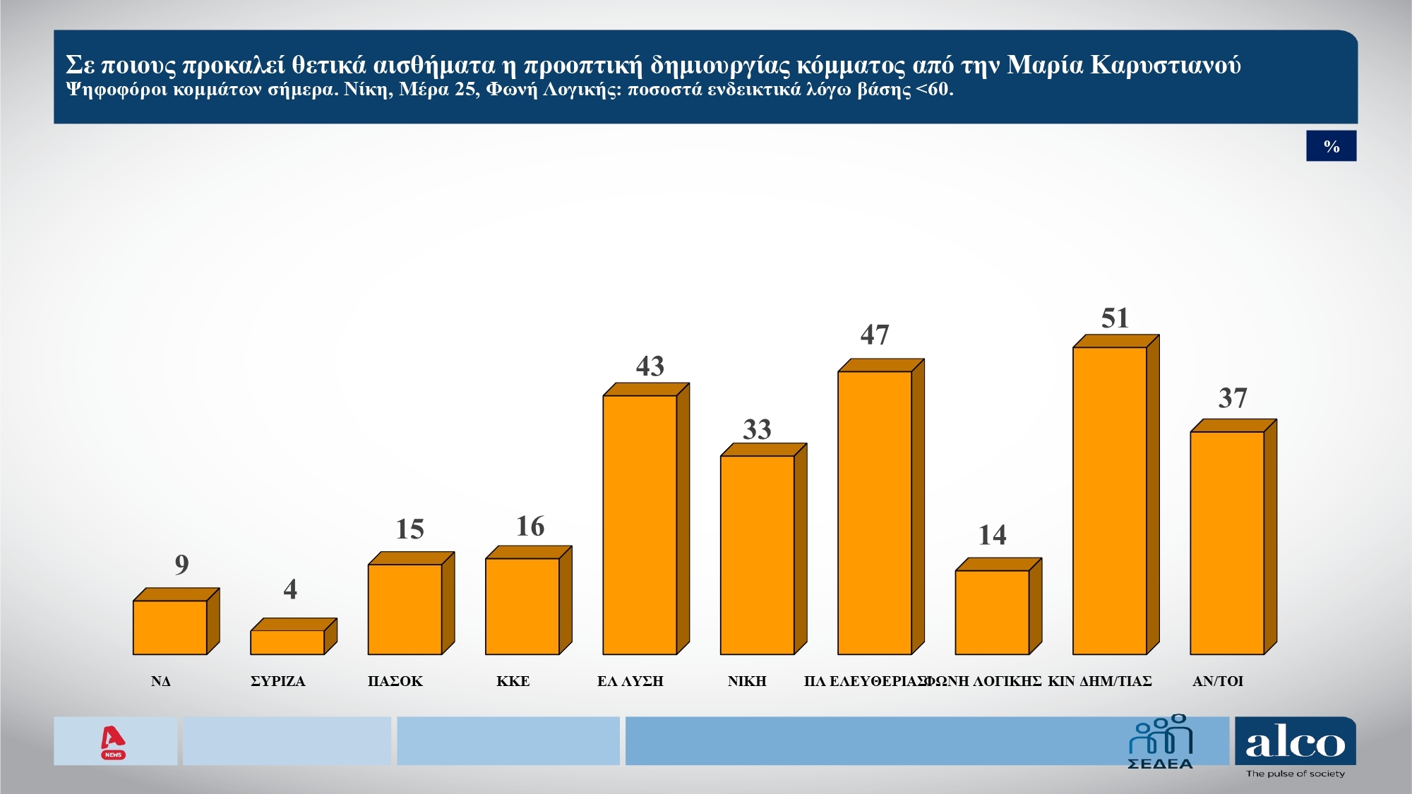 Η Νέα Δημοκρατία προηγείται με 13 μονάδες διαφορά του ΠΑΣΟΚ στην πρόθεση ψήφου σύμφωνα με τη δημοσκόπηση της Alco για το κεντρικό δελτίο ειδήσεων του Alpha.