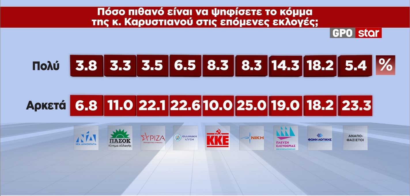Μεγαλύτερη διείσδυση φαίνεται να έχει η Μ. Καρυστιανού στη Φωνή Λογικής, στην Πλεύση Ελευθερίας, στη Νίκη, στην Ελληνική Λύση και στους αναποφάσιστους.
