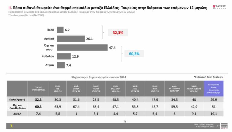 Στο ερώτημα «Πόσο πιθανό θεωρείτε ένα θερμό επεισόδιο μεταξύ Ελλάδας-Τουρκίας στη διάρκεια των επόμενων 12 μηνών», οι πολίτες σε ποσοστό 32.3 % απαντούν «πολύ» και «αρκετά».