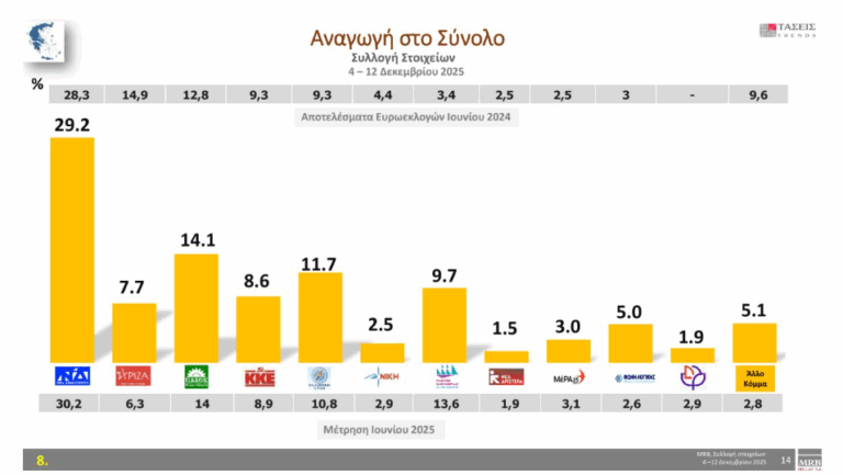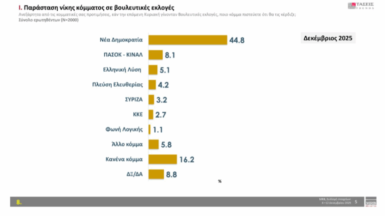 Ποσοστό 22,6% συγκεντρώνει η ΝΔ στην πρόθεση ψήφου σε δημοσκόπηση της MRB για τον Δεκέμβριο. Βάσει της έρευνας που διεξήχθη από 4/12 έως 12/12, ακολουθούν το ΠΑΣΟΚ με 10.9%, η Ελληνική Λύση με 9.1 %, η Πλεύση Ελευθερίας με 7.5 %, το ΚΚΕ 6.7%, ο ΣΥΡΙΖΑ με 6 %, η Φωνή Λογικής με 3.9 %, το ΜέΡΑ25 με 2.3%, η Νίκη με 1.9 %, το Κίνημα Δημοκρατίας με 1.5%, και η Νέα Αριστερά με 1.2%.