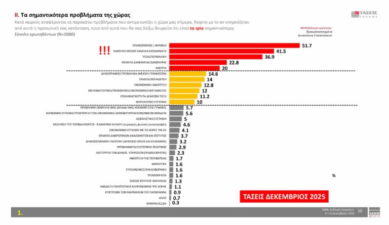Σχετικά με τα προβλήματα της χώρας, οι πολίτες αναγνωρίζουν ως σημαντικότερα: πληθωρισμός/ακρίβεια με 51.7 %, χαμηλοί μισθοί/χαμηλά εισοδήματα με 41.5 % και υγεία/περίθαλψη με 36.9 %.