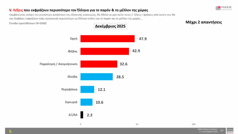 Η λέξη που εκφράζει περισσότερο τους πολίτες για το παρόν και το μέλλον της χώρας είναι «οργή» με ποσοστό 47.9 % και ακολουθούν ο «Φόβος» με 42.9 % και η «Παραίτηση/Απογοήτευση» με 32.6 %.