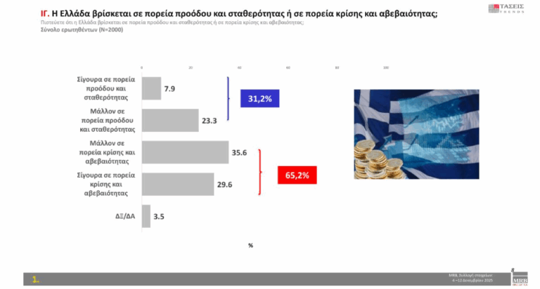 Στο ερώτημα «πιστεύετε ότι η Ελλάδα βρίσκεται σε πορεία προόδου και σταθερότητας ή σε πορεία κρίσης και αβεβαιότητας» το 65.2 % απαντά «Μάλλον σε πορεία κρίσης και αβεβαιότητας/Σίγουρα σε πορεία κρίσης και αβεβαιότητας» και το 31.2 % «Σίγουρα σε πορεία προόδου και σταθερότητας/Μάλλον σε πορεία προόδου και σταθερότητας».