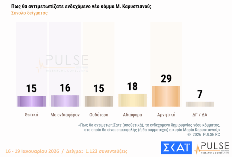 Το υπό δημιουργία κόμμα που δείχνει να συγκεντρώνει το μεγαλύτερο ποσοστό αποδοχής, είναι της Μαρίας Καρυστιανού με αυτό του πρώην πρωθυπουργού, Αλέξη Τσίπρα να ακολουθεί και μετά να έρχεται αυτό του επίσης πρώην πρωθυπουργού, Αντώνη Σαμαρά. Η αποδοχή που τυγχάνει το «κόμμα» Καρυστιανού ανέρχεται στο 31% (θετικά και με ενδιαφέρον), ενώ του Αλέξη Τσίπρα είναι στο 19% και του Αντώνη Σαμαρά στο 10%.