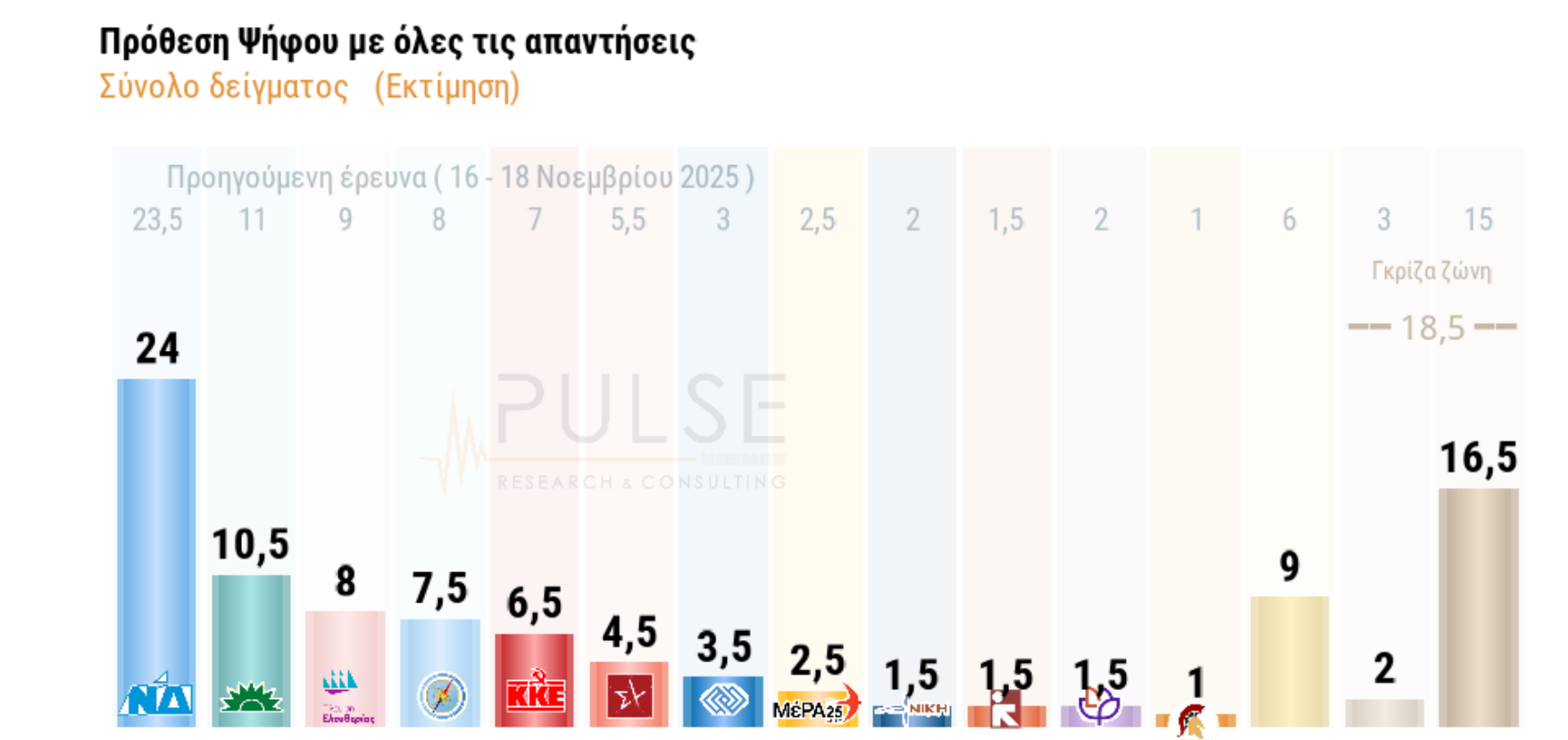 Στο 24% βρίσκεται η ΝΔ στην πρόθεση ψήφου σε δημοσκόπηση της Pulse για τον ΣΚΑΪ, με το ΠΑΣΟΚ να ακολουθεί στο 10,5% και μετά η Πλεύση Ελευθερίας (8%), η Ελληνική Λύση (7,5%), το ΚΚΕ (6,5%), ο ΣΥΡΙΖΑ-ΠΣ (4,5%), η Φωνή Λογικής (3,5%) το Μέρα25 (2,5%), η Νίκη (1,5%), η Νέα Αριστερά (1,5%), το Κίνημα Δημοκρατίας (1,5%) και οι Σπαρτιάτες στο 1%.