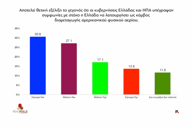 Ως προς τις συμφωνίες ώστε η Ελλάδα να λειτουργήσει ως κόμβος διαμεταγωγής του αμερικανικού LNG, το 57,7% (30,6% «σίγουρα ναι» και 27,1% «μάλλον ναι») τις αξιολογούν θετικά.