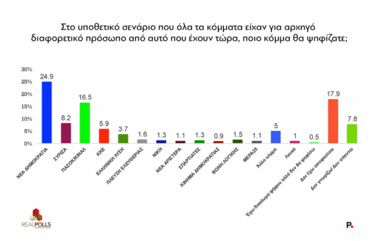 «Στο υποθετικό σενάριο που όλα τα κόμματα είχαν για αρχηγό διαφορετικό πρόσωπο από αυτό που έχουν τώρα, ποιο κόμμα θα ψηφίζατε;». H εικόνα δεν αλλάζει. Σε περίπτωση που η ΝΔ άλλαζε αρχηγό θα είχε μόνο οριακά οφέλη, ενώ το ΠΑΣΟΚ-ΚΙΝΑΛ θα εκτινασσόταν στο 16,5% στην πρόθεση ψήφου και ο ΣΥΡΙΖΑ θα υπερδιπλασίαζε τα ποσοστά του. Αντιθέτως, όλα τα αρχηγικά-προσωποπαγή κόμματα (Ελληνική Λύση και κυρίως Πλεύση Ελευθερίας, Κίνημα Δημοκρατίας, Φωνή Λογικής, ΜέΡΑ25) θα εξαϋλωνόταν.