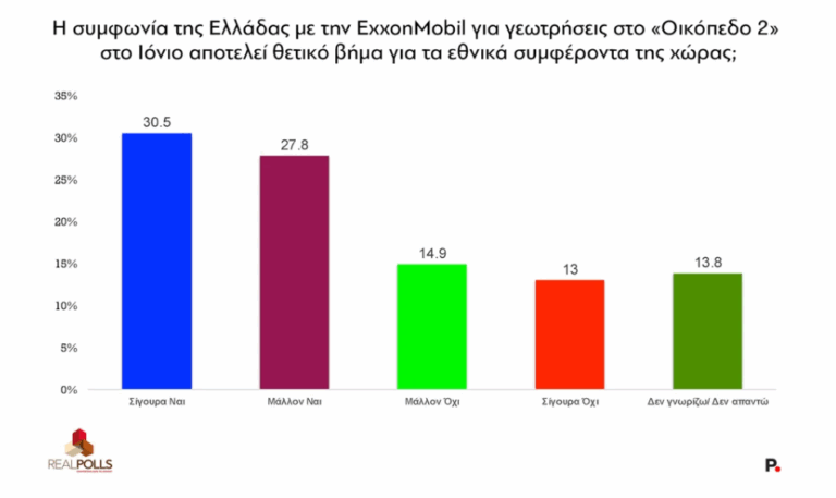 Καθώς το αποτύπωμα των ενεργειακών συμφωνιών του Ζαππείου είναι εμφανές στον δημοσκοπικό χάρτη, αναζητήθηκε η άποψη των πολιτών τόσο ως προς αυτές καθαυτές τις συμφωνίες, όσο και γενικά ως προς την γεωστρατηγική πολιτική της κυβέρνησης. Οι πρόσφατες συμφωνίες που ανακοινώθηκαν πανηγυρικά κατά τη Σύνοδο για τη Διατλαντική Ενεργειακή Συνεργασία (6-7 Νοεμβρίου) έχουν ευρεία στήριξη. Ως προς την ανακοίνωση για τις γεωτρήσεις της αμερικανικής ExxonMobil στο Ιόνιο, το 58,3% (30,5% «σίγουρα ναι» και 27,8% «μάλλον ναι») κρίνει ότι αποτελεί θετικό βήμα για τα εθνικά συμφέροντα.