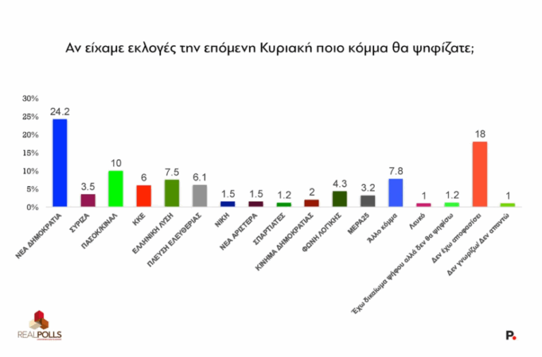 Στην πρόθεση ψήφου, η Νέα Δημοκρατία μετρήθηκε στο 24,2%, καταγράφοντας άνοδο 0,4% σε σύγκριση με την προηγούμενη μέτρηση, ενώ το ΠΑΣΟΚ-ΚΙΝΑΛ έφτασε ξανά στο διψήφιο, 10%, κερδίζοντας 1,4% από τον Οκτώβριο. Η υποχώρηση της Πλεύσης Ελευθερίας στο 6,1% (από 7,6%) έδωσε την ευκαιρία στην Ελληνική Λύση να περάσει στην τρίτη θέση με 7,5% στην πρόθεση ψήφου (από 7,2%). Πέμπτο είναι το ΚΚΕ με 6% (από 5,7%) και στην έκτη θέση (!) αναρριχήθηκε η Φωνή της Λογικής με 4,3% (από 3,8%), κερδίζοντας από την υποχώρηση του ΣΥΡΙΖΑ στο 3,5% (από 4,5%) και του ΜέΡΑ25 στο 3,2% (από 4,4%).