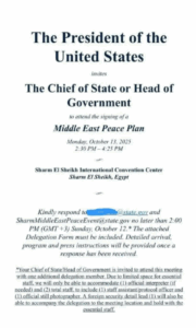 Σύμφωνα με το Axios, το Υπουργείο Εξωτερικών των ΗΠΑ εξέδωσε επίσημη πρόσκληση για τη σύνοδο κορυφής των ηγετών για τη Γάζα, η οποία θα πραγματοποιηθεί τη Δευτέρα στο Σαρμ Ελ Σέιχ. Οι ΗΠΑ έχουν επεκτείνει σημαντικά τη λίστα των προσκεκλημένων, προσθέτοντας την Ισπανία, την Ιαπωνία, το Αζερμπαϊτζάν, την Αρμενία, την Ουγγαρία, την Ινδία, το Ελ Σαλβαδόρ, την Κύπρο, την Ελλάδα, το Μπαχρέιν, το Κουβέιτ και τον Καναδά.