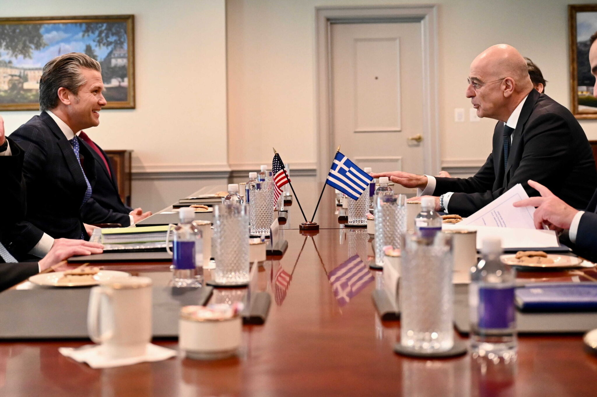 Όπως δήλωσε ο κ. Δένδιας μετά την ολοκλήρωση της συνάντησης με τον κ. Χέγκσεθ, «είχα σ’ αυτήν τη συνάντηση τη δυνατότητα να εξηγήσω τις ελληνικές θέσεις σε μια σειρά από ευρύτερα προβλήματα που αφορούν την περιοχή μας, τις στρατηγικές προκλήσεις τις οποίες αντιμετωπίζουμε και την προσπάθεια που κάνουμε να μεταρρυθμίσουμε τις ελληνικές Ένοπλες Δυνάμεις, την “Ατζέντα 2030”. Επίσης, αναφέρθηκα σε μια σειρά από συμβάσεις που έχουμε υπογράψει με τις ΗΠΑ, όπως τη σύμβαση για την αγορά των F-35 και στον τρόπο με τον οποίο αυτές οι συμβάσεις θα εκτελεστούν με τον καλύτερο τρόπο για τις ελληνικές Ένοπλες Δυνάμεις. Τέλος, είχα και εγγράφως προσκαλέσει τον Υπουργό να επισκεφθεί την Ελλάδα και θα είναι χαρά μας να τον υποδεχθούμε, καθόσον θυμάμαι δεν είναι συχνή η επίσκεψη Αμερικανού Υπουργού Άμυνας στην Πατρίδα μας».