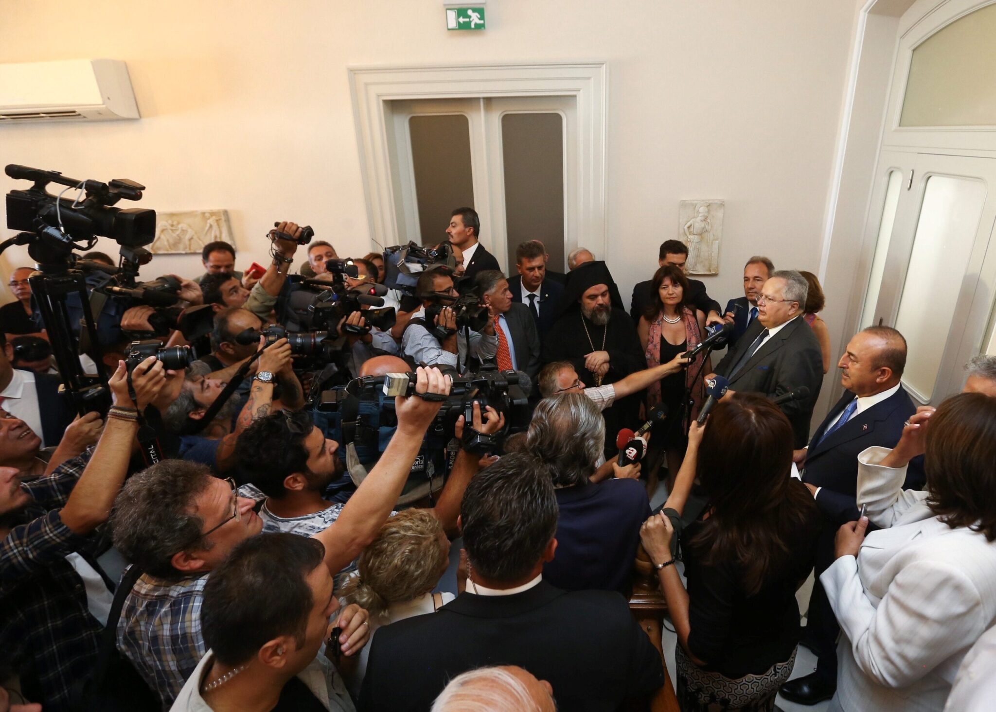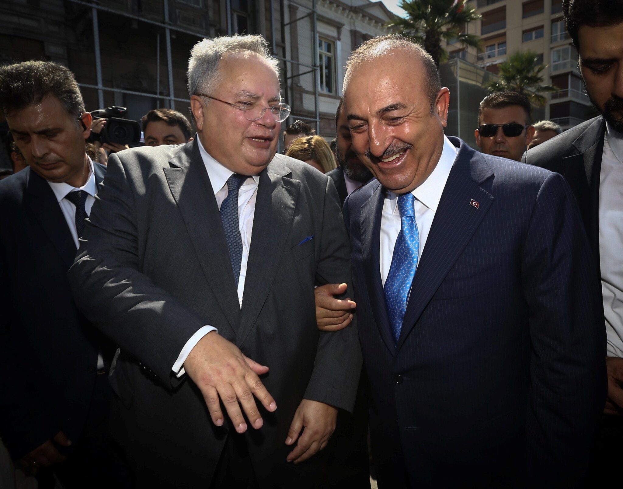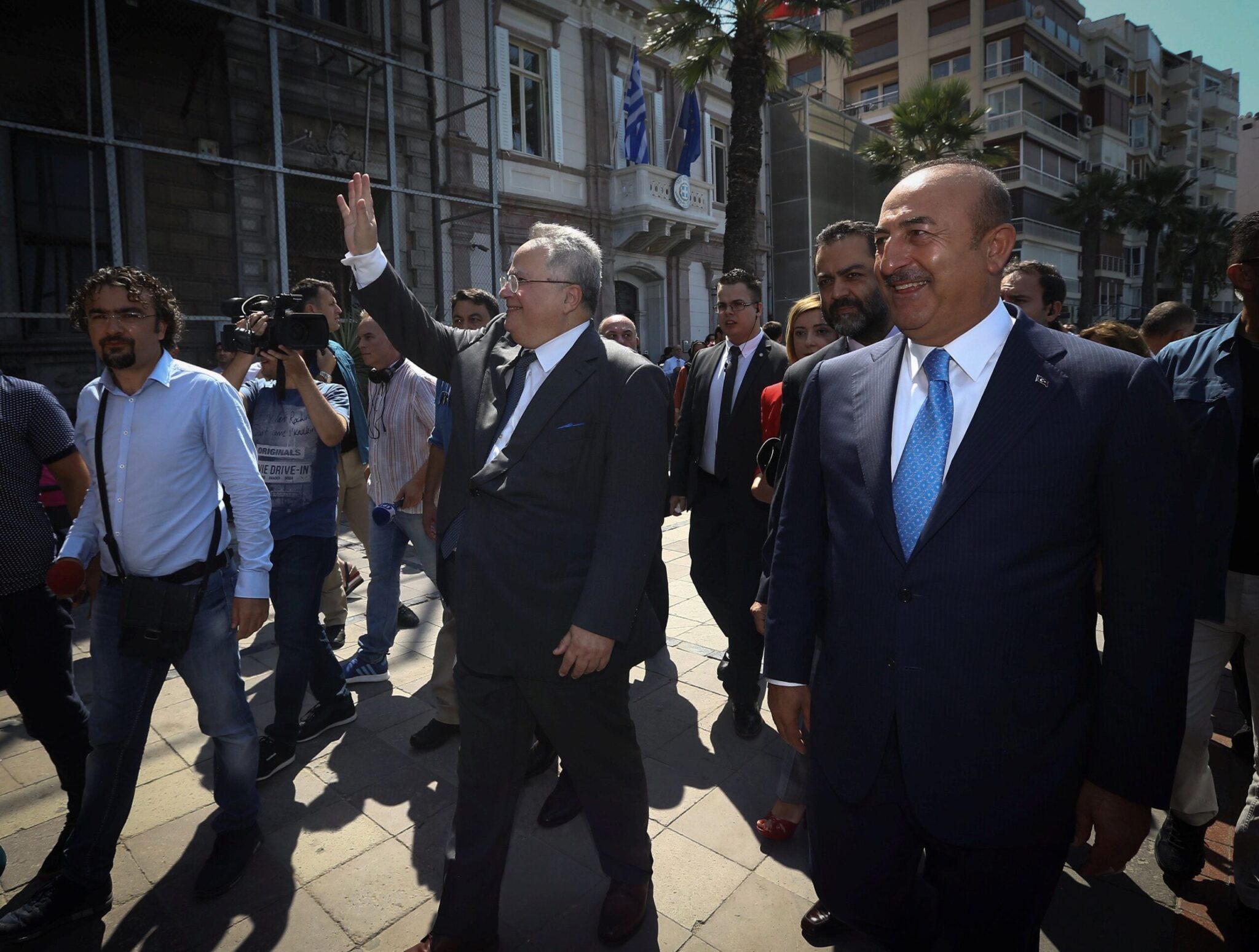 Μετά τα εγκαίνια του ανακαινισμένου προξενείου της Ελλάδας στη Σμύρνη, Νίκος Κοτζιάς και Μεβλούτ Τσαβούσογλου, περπάτησαν στους δρόμους της πόλης, σε χαλαρή διάθεση, παρόλο που νωρίτερα είχαν ανταλλάξει μπηχτές, με αφορμή την υπόθεση των 8 Τούρκων, στους οποίους δόθηκε άσυλο από την ελληνική δικαιοσύνη.