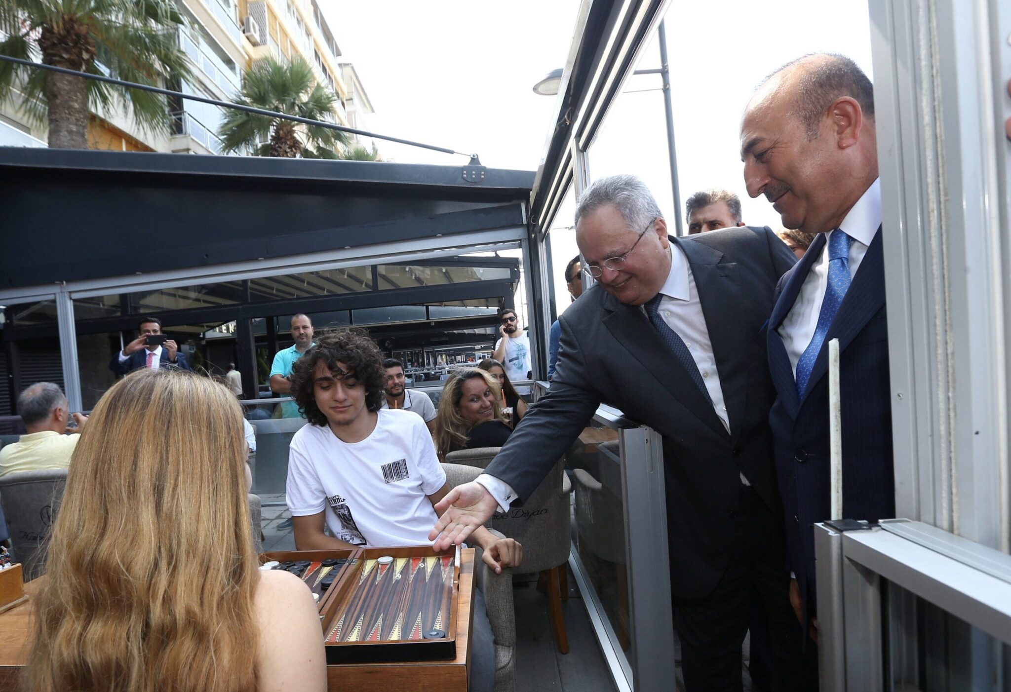 Ο Νίκος Κοτζιάς δε, σχολίασε ακόμα και ένα νεαρό ζευγάρι που έπαιζε τάβλι, με τον Τσαβούσογλου να παρακολουθεί τον σύντομο διάλογο.