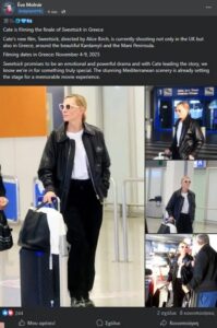 Στην Ελλάδα βρίσκεται η βραβευμένη με Όσκαρ Αυστραλή ηθοποιός Κέιτ Μπλάνσετ, για τα γυρίσματα της νέας της ταινίας με τίτλο «Sweetsick», η οποία αναμένεται να γυριστεί εξ ολοκλήρου στη Μεσσηνία. Οι πρώτες φωτογραφίες από την άφιξή της στο αεροδρόμιο «Ελευθέριος Βενιζέλος» κυκλοφόρησαν στα μέσα κοινωνικής δικτύωσης, προκαλώντας ενθουσιασμό στους θαυμαστές της. Παρά τη διεθνή της φήμη, η Μπλάνσετ εμφανίστηκε απλή και ανεπιτήδευτη, επιλέγοντας μαύρη φόρμα, δερμάτινο τζάκετ και αθλητικά παπούτσια, δείχνοντας διάθεση να κρατήσει χαμηλό προφίλ.