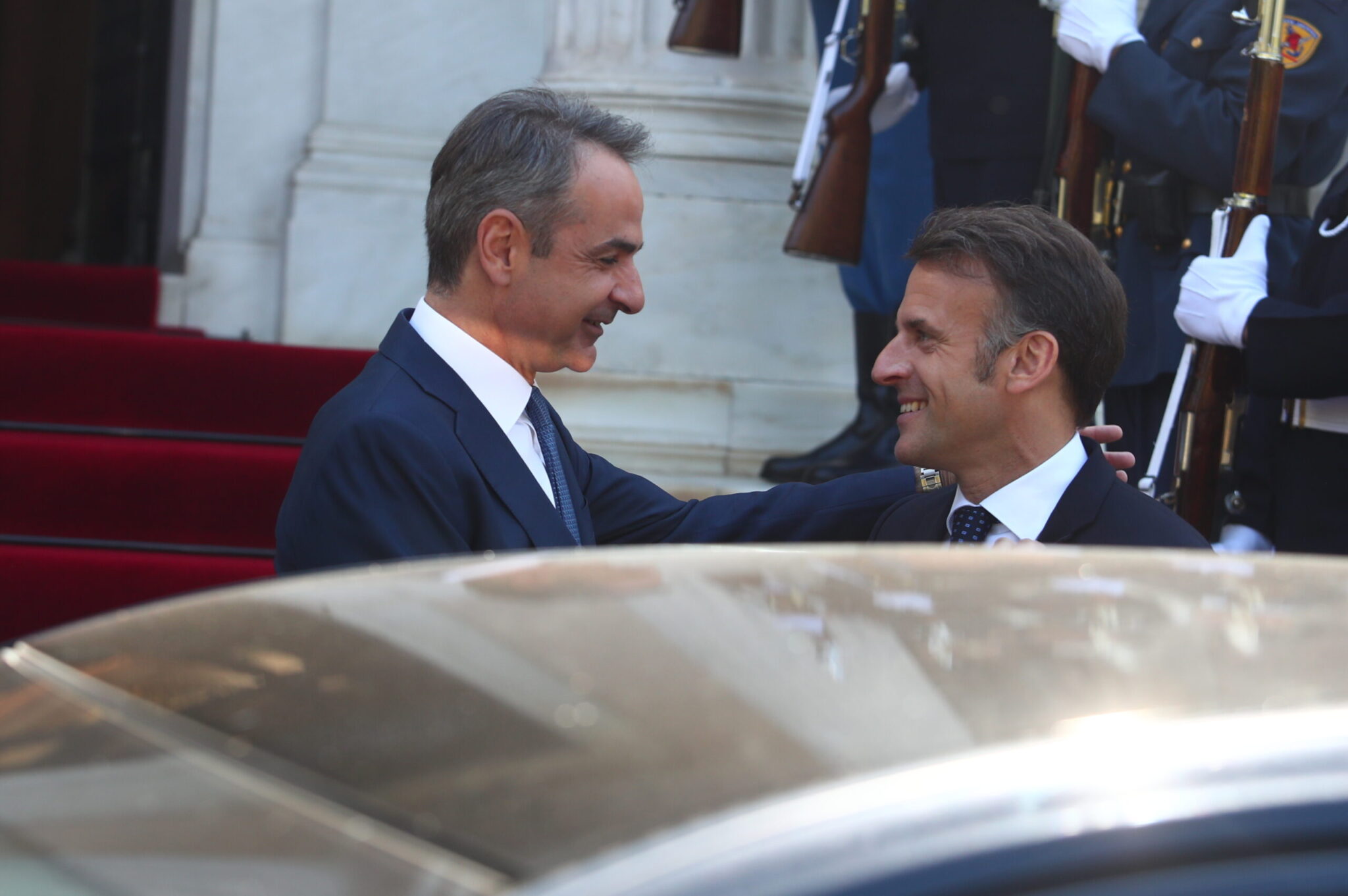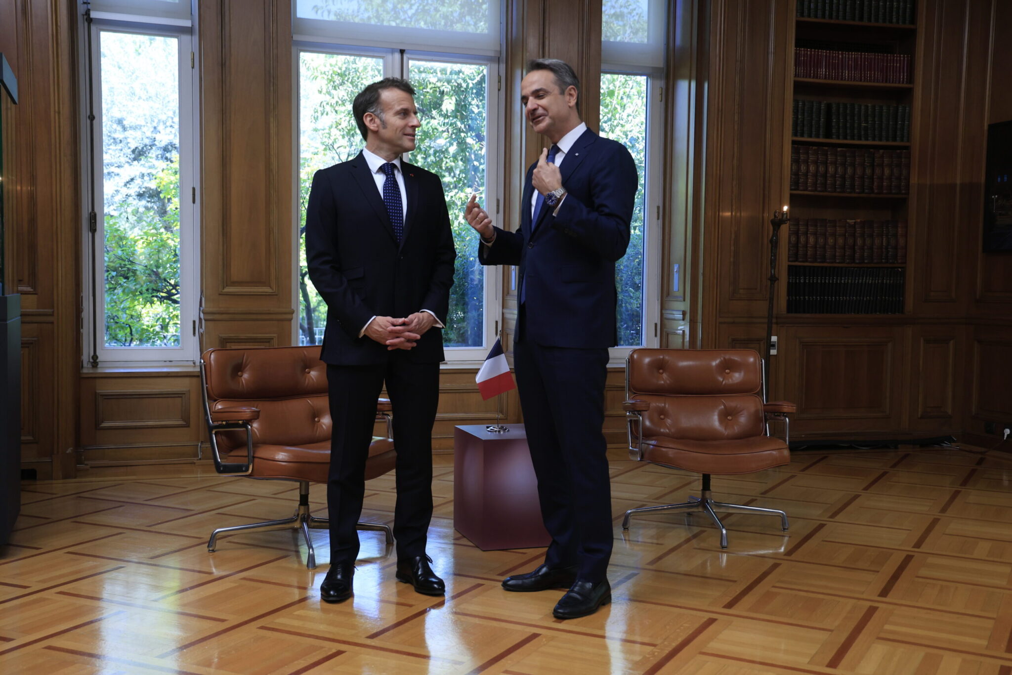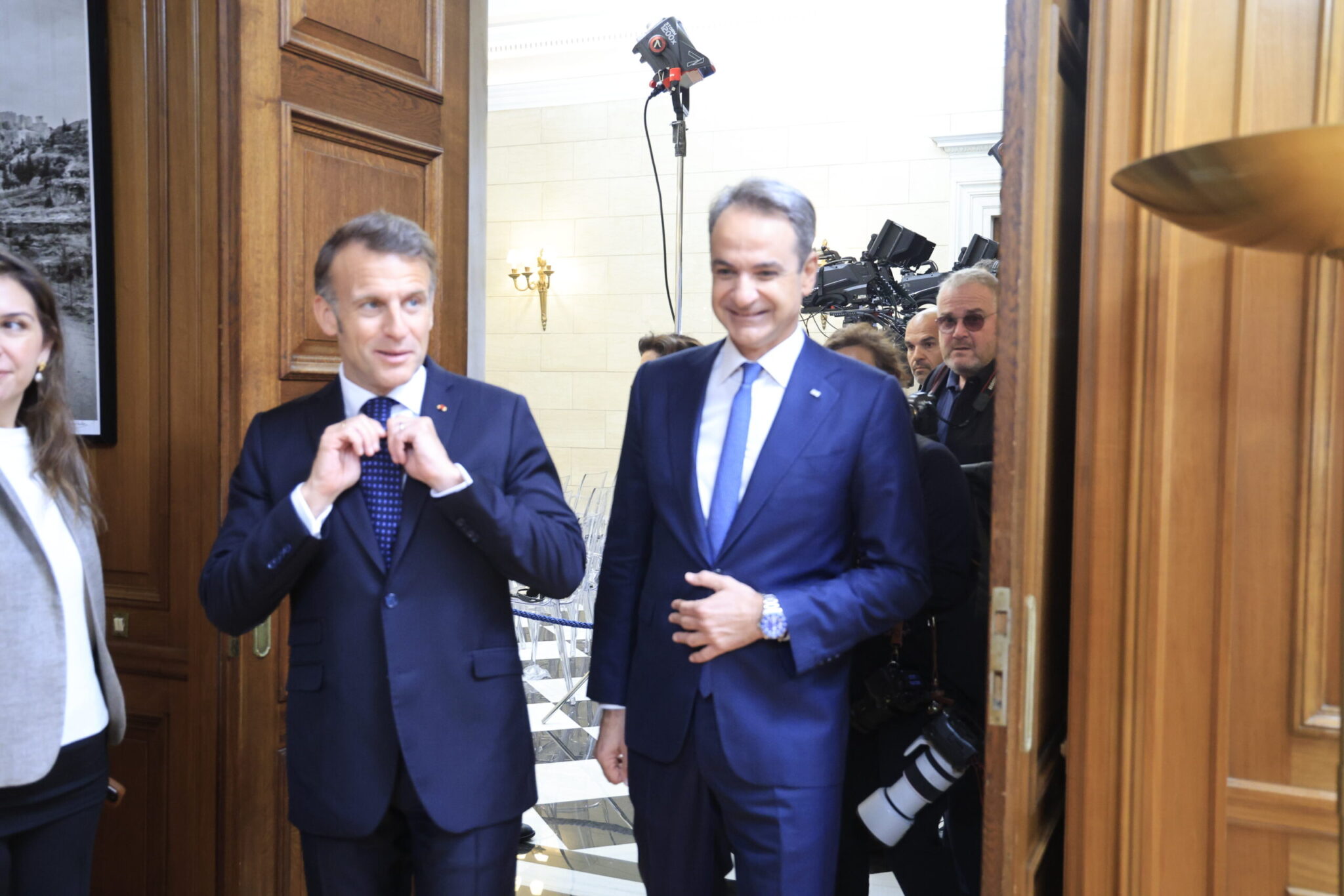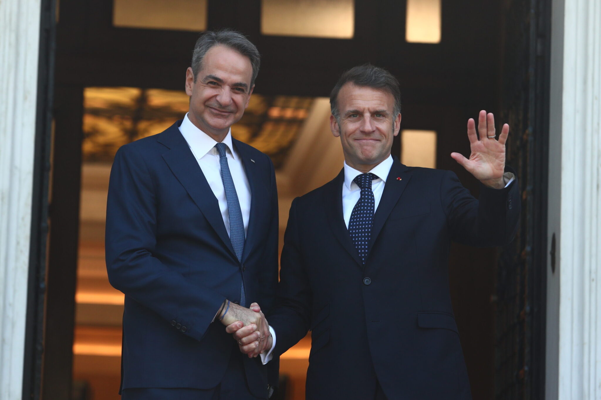 Μετά την επιθεώρηση της φρεγάτας «Κίμων» στον Πειραιά, Κυριάκος Μητσοτάκης και Εμανουέλ Μακρόν είχαν συνάντηση στο Μέγαρο Μαξίμου.