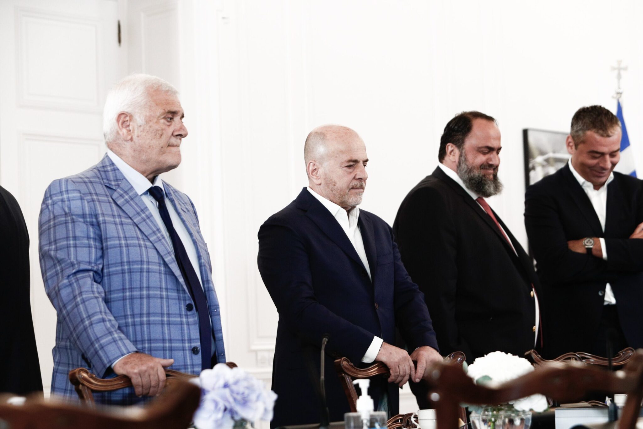 Έχει μεγάλο ενδιαφέρον η φωτογραφική αποτύπωση με τα πρόσωπα του Βαγγέλη Μαρινάκη από μέρους το Ολυμπιακού, του Γιάννη Αλαφούζου από μέρους του Παναθηναϊκού και του Δημήτρη Μελισσανίδη από μέρους της ΑΕΚ, καθώς παίρνουν θέσεις στην ίδια πλευρά του τραπεζιού – αριστερά όπως βλέπουμε στις φωτογραφίες – με τον πρωθυπουργό Κυριάκο Μητσοτάκη στην κεφαλή.