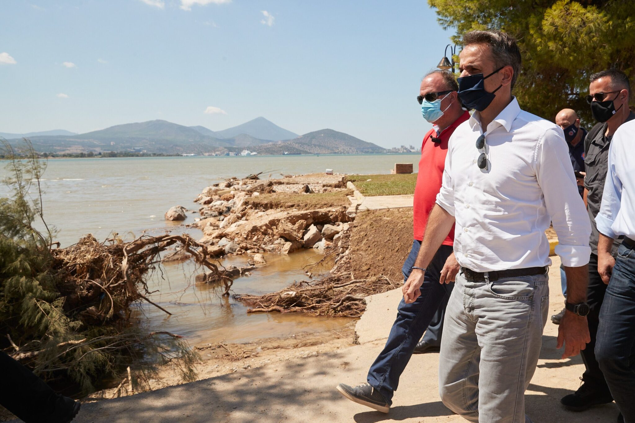 O πρωθυπουργός ο οποίος εξέφρασε και πάλι την οδύνη και τα συλλυπητήριά του στις οικογένειες των θυμάτων, πραγματοποίησε αρχικά εναέρια αυτοψία των πληγεισών περιοχών με ελικόπτερο της Πυροσβεστικής, συνοδευόμενος από τον υπουργό Εσωτερικών Τάκη Θεοδωρικάκο, τον υφυπουργό Προστασίας του Πολίτη Νίκο Χαρδαλιά, τον γενικό γραμματέα Πολιτικής Προστασίας Βασίλη Παπαγεωργίου και τον γενικό γραμματέα Υποδομών, Γιώργο Καραγιάννη.