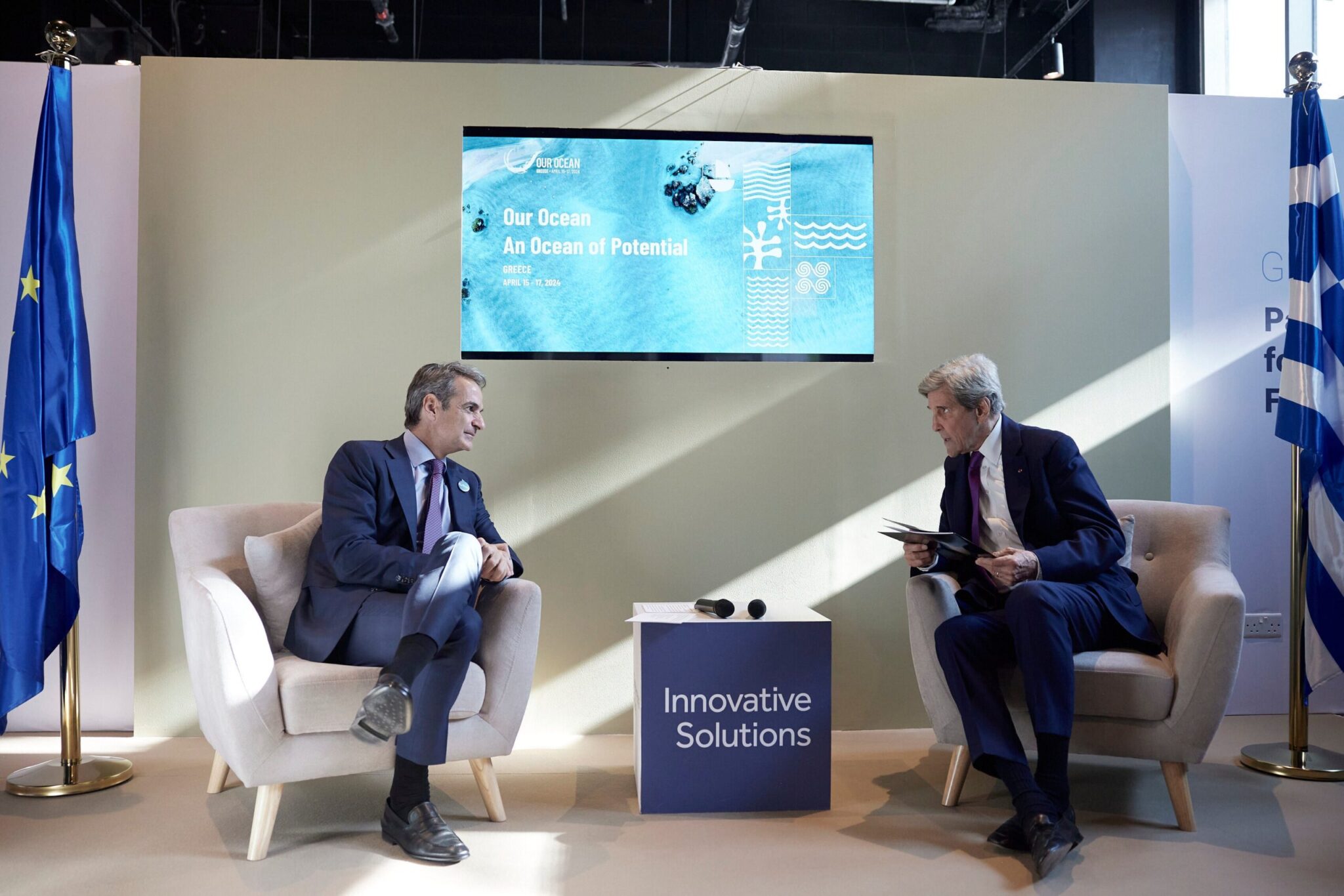 Νωρίτερα, ο Κυριάκος Μητσοτάκης συμμετείχε σε συζήτηση με τον Ειδικό Απεσταλμένο του Προέδρου των Ηνωμένων Πολιτειών για το Κλίμα και πρώην Υπουργό Τζον Κέρι, στο πλαίσιο εκδήλωσης για την 9η διάσκεψη «Our Ocean Conference», η οποία το 2024 θα φιλοξενηθεί στην Ελλάδα, στις 16 και 17 Απριλίου.