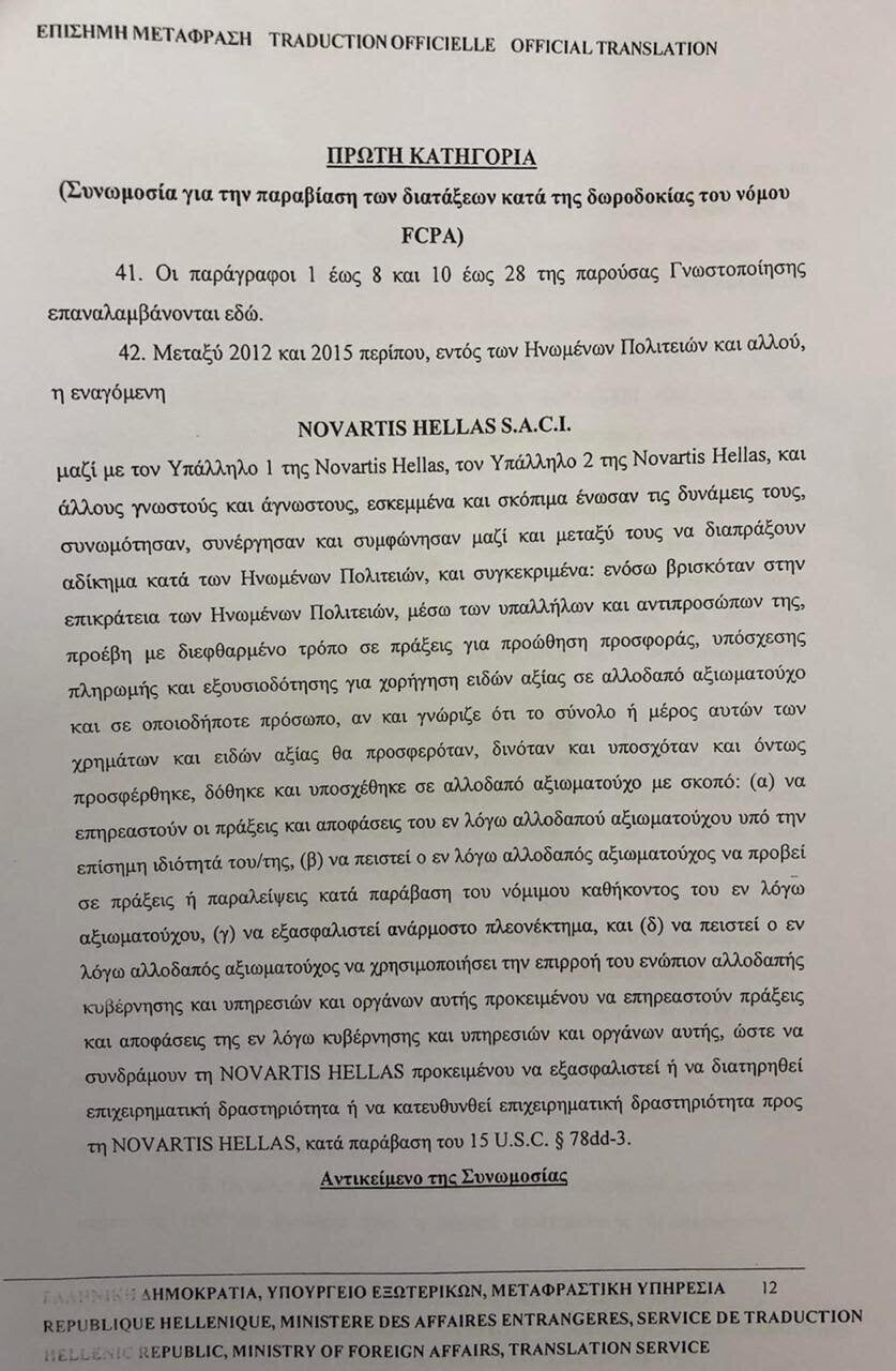 Ειδικότερα, πηγές της ΝΔ εμμένουν ότι από την επίσημη μετάφραση εκείνο που προκύπτει είναι πως η Novartis κλήθηκε να πληρώσει για παράνομες πρακτικές σε συνταγογραφήσεις φαρμάκων και κλινικές δοκιμές από υπαλλήλους της ιατρούς και παρόχους υπηρεσιών υγείας. Κατηγορούν επίσης τον ΣΥΡΙΖΑ ότι η μετάφραση εκθέτει για ακόμη μια φορά τους σκευωρούς.