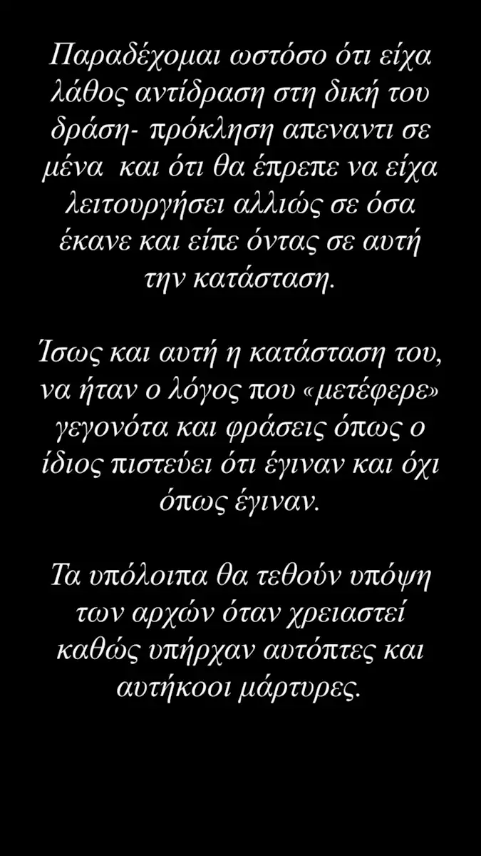 Παραδέχομαι ωστόσο ότι είχα λάθος αντίδραση στη δική του δράση- πρόκληση απέναντι σε μένα και ότι θα έπρεπε να είχα λειτουργήσει αλλιώς σε όσα έκανε και είπε όντας σε αυτή την κατάσταση.
