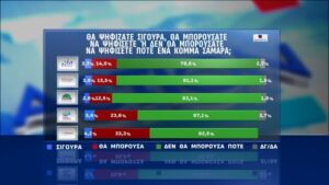 Ένα κόμμα Τσίπρα θα ψήφιζε «σίγουρα» το 8,9% και «πιθανόν» το 21,1%, ενώ το 65,7% δηλώνει ότι δεν θα το ψήφιζε ποτέ. Αντίστοιχα, ένα κόμμα Σαμαρά συγκεντρώνει 3,5% σίγουρη ψήφο και 16,9% πιθανή, με 75,6% να το απορρίπτει.