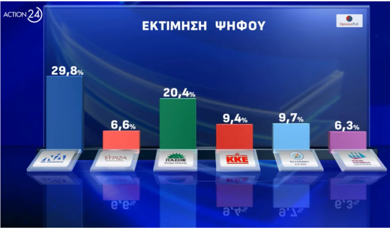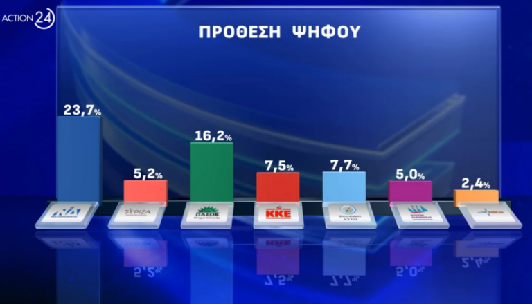 Το ΠΑΣΟΚ, βρίσκεται σταθερά στη δεύτερη θέση με 16,2%, ενώ η ΝΔ διατηρεί την πρωτιά με ποσοστό 23.7%.
