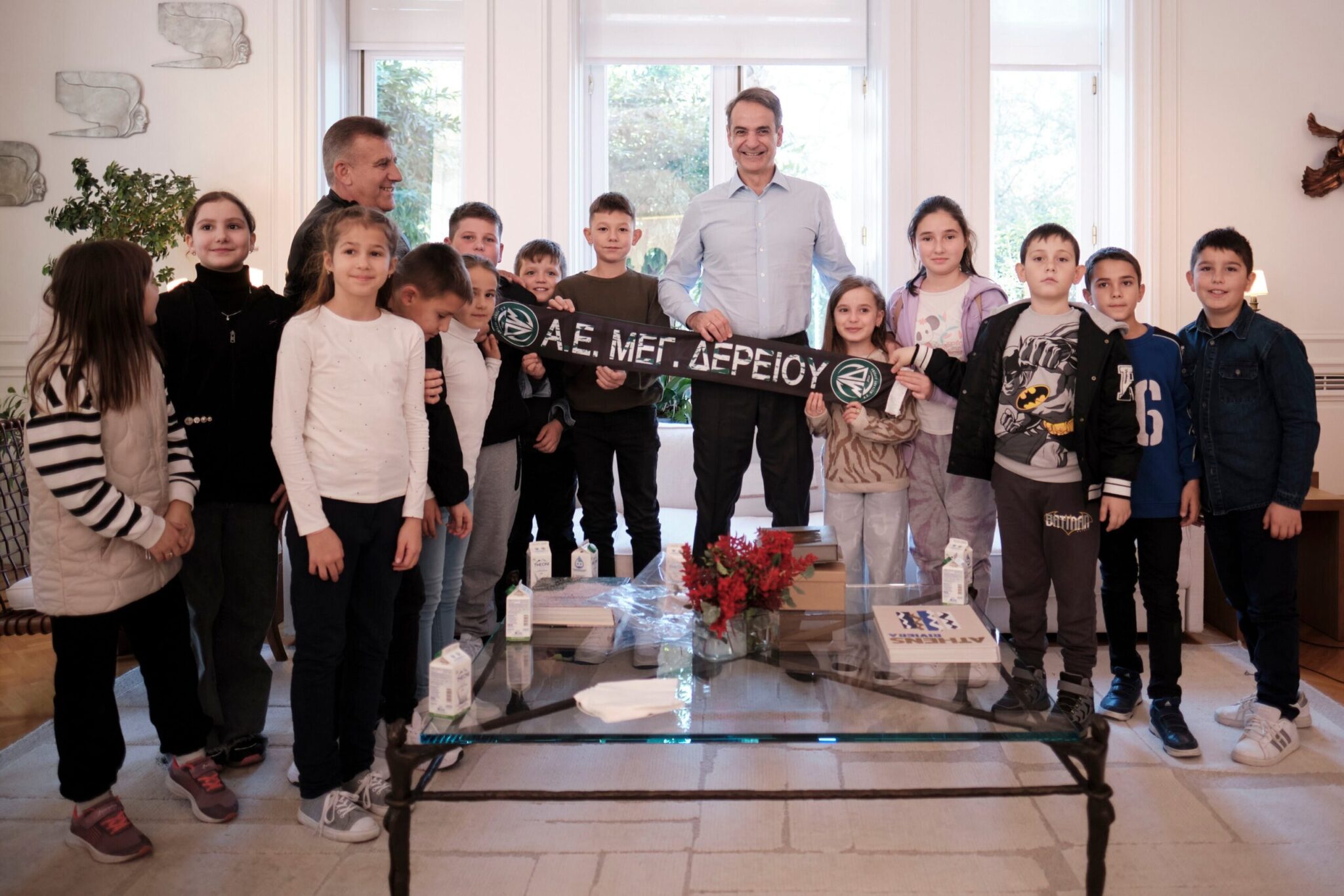 Με μαθήτριες και μαθητές του μειονοτικού Δημοτικού Σχολείου και του Σχολείου Δεύτερης Ευκαιρίας της κοινότητας Μεγάλου Δερείου του Δήμου Σουφλίου στον Έβρο συναντήθηκε ο Κυριάκος Μητσοτάκης, στο Μέγαρο Μαξίμου. Εδώ ο πρωθυπουργός με μαθήτριες και μαθητές του Δημοτικού Σχολείου, κρατώντας το κασκόλ της τοπικής ποδοσφαιρικής ομάδας που του προσέφεραν ως δώρο.Dimitris Papamitsos