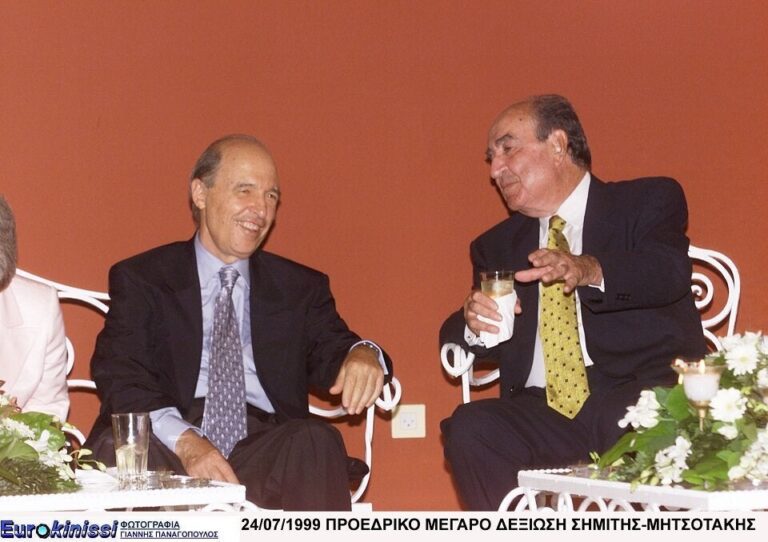 Ο τότε πρόεδρος της Δημοκρατίας, Κωνσταντίνος Καραμανλής, με τον χαμογελαστό πρωθυπουργό, Κωνσταντίνο Μητσοτάκη.
