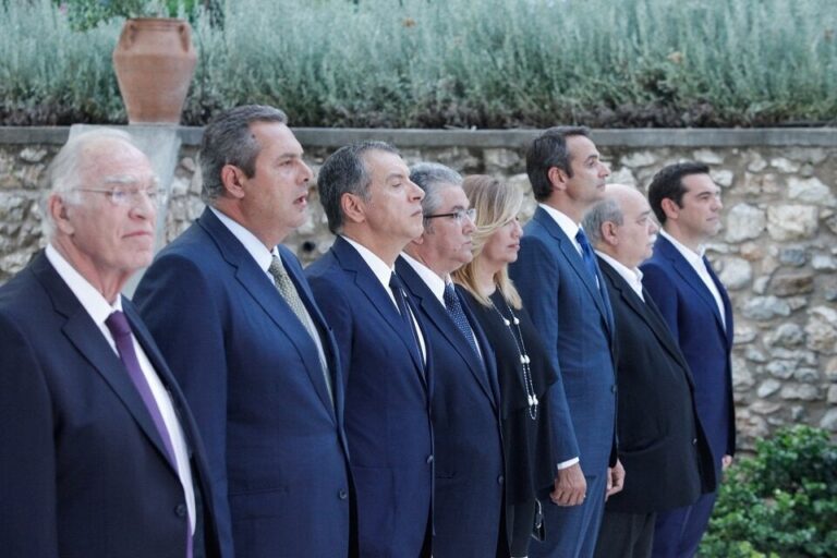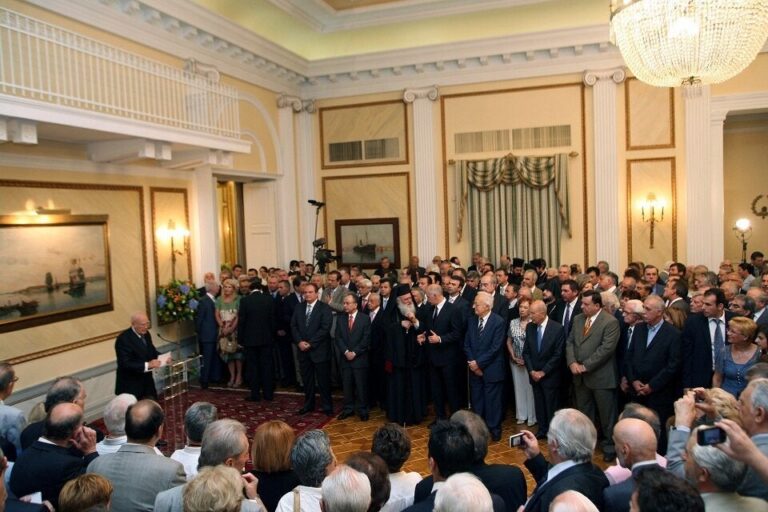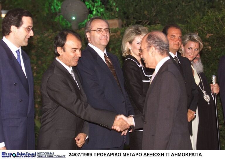 Ο πρόεδρος της Δημοκρατίας, Κωστής Στεφανόπουλος, καλωσορίζει δια χειραψίας τους πολιτικούς αρχηγούς Κώστα Καραμανλή, Νίκο Κωνσταντόπουλο, Δημήτρη Τσοβόλα και Αντώνη Σαμαρά.EUROKINISSIO πρωθυπουργός, Κώστας Σημίτης, τα λέει με τον αείμνηστο Κωνσταντίνο Μητσοτάκη.EUROKINISSI